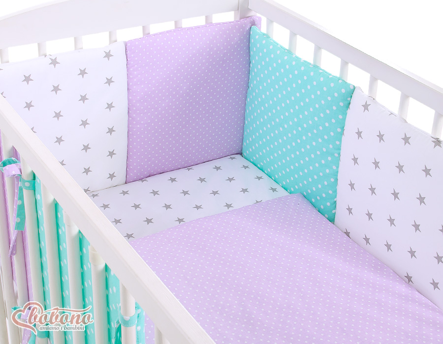 3-8. Universal bumper 6pcs- the bumper is made of 6 pillows filled with a special non-allergic and breathable silicone Filling (certified OKOTEX). The size of one pillow is 32cm x 32cm. Cover of the bumper or made of 100% cotton. Pillows have fastening strips to match them each other. You can match the pillows in any order. It is a perfect decoration of baby cot. If we match every pillows together the bumper can be used as a playing mat for baby.