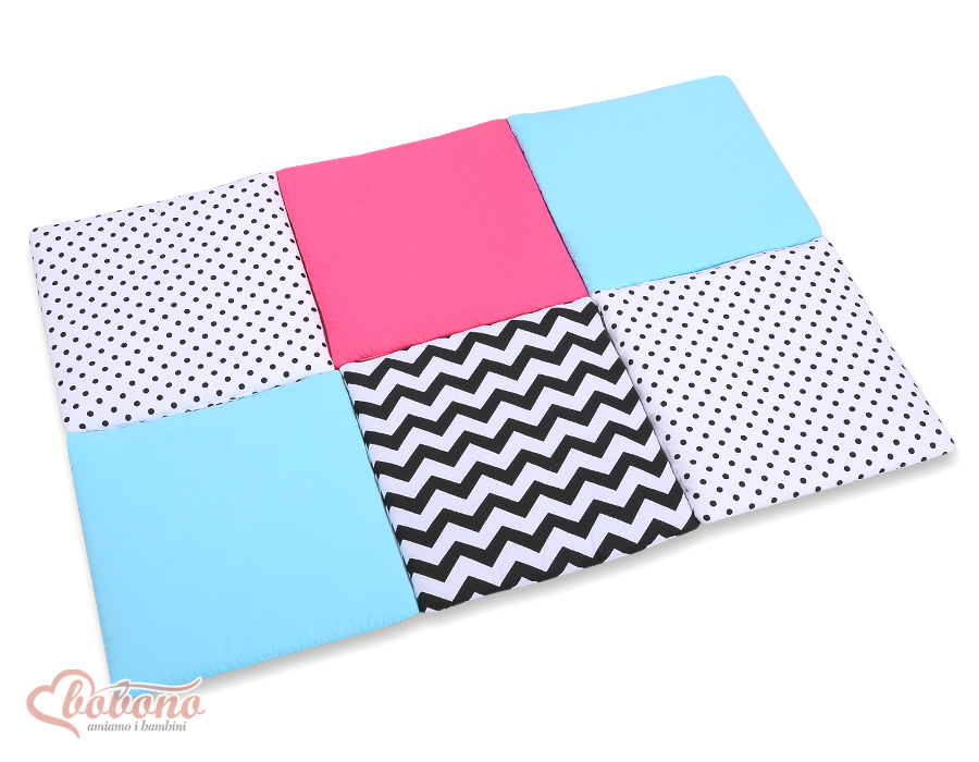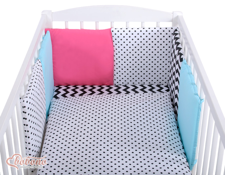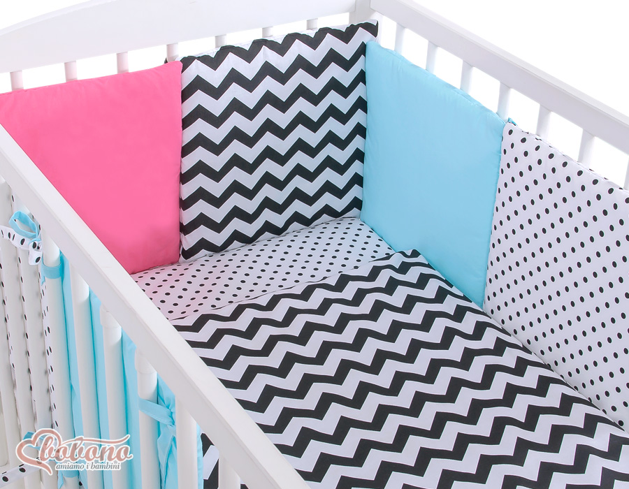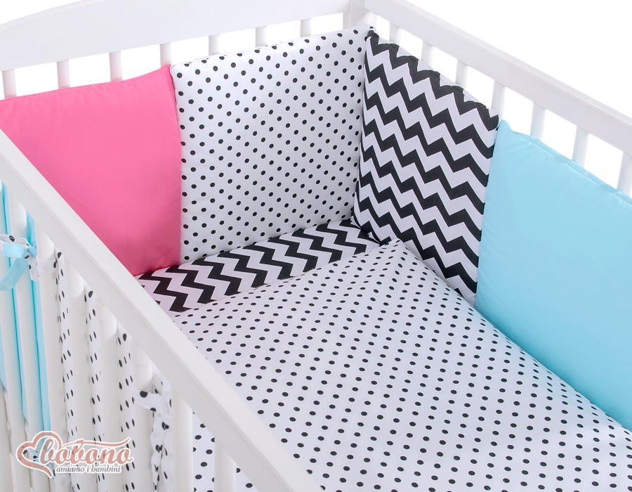 3-8. Universal bumper 6pcs- the bumper is made of 6 pillows filled with a special non-allergic and breathable silicone Filling (certified OKOTEX). The size of one pillow is 32cm x 32cm. Cover of the bumper or made of 100% cotton. Pillows have fastening strips to match them each other. You can match the pillows in any order. It is a perfect decoration of baby cot. If we match every pillows together the bumper can be used as a playing mat for baby.