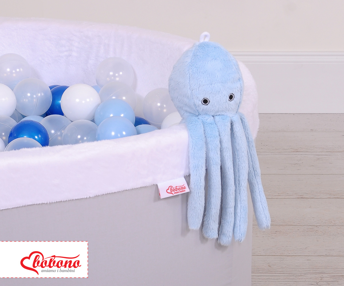 Funny cuddly octopus is perfect for sleeping and cuddling for each baby. Arms of ostopus are comfortable to hold by tiny baby hands. The octopus is perfect and safe for babies from firsts moments of life. With the gentle rattle noise it draws the attention of the child on itself. Made of soft touch, fluffy and delicate minky fleece. The filling inside the pillow it is Eco Fillball- atested Silicone Balls - "artificial fluff" for pillows- filling ensures proper settlement of the baby and air circulation.