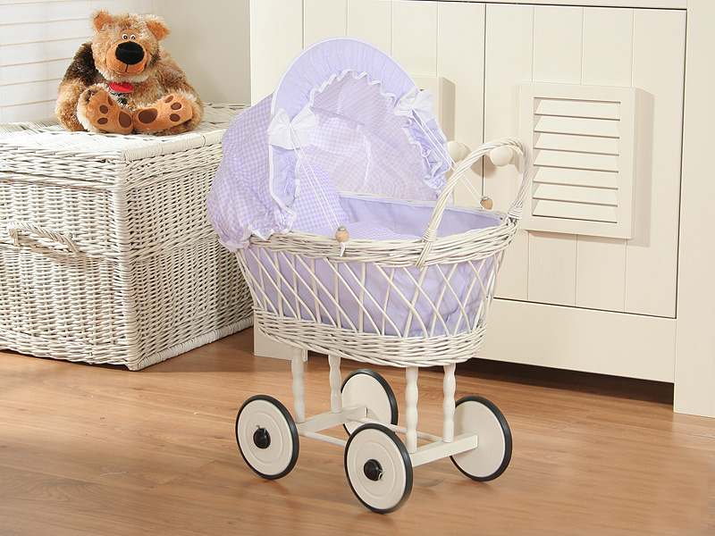 Doll pram made of White Wicker Lilac check Bedding