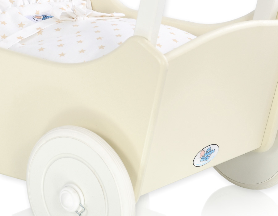 The wheels have non-slip tires that do not scratch the floor. The doll pram has an adjustable wooden handle. It can be mounted on two heights (53cm or 55cm measured from the floor).