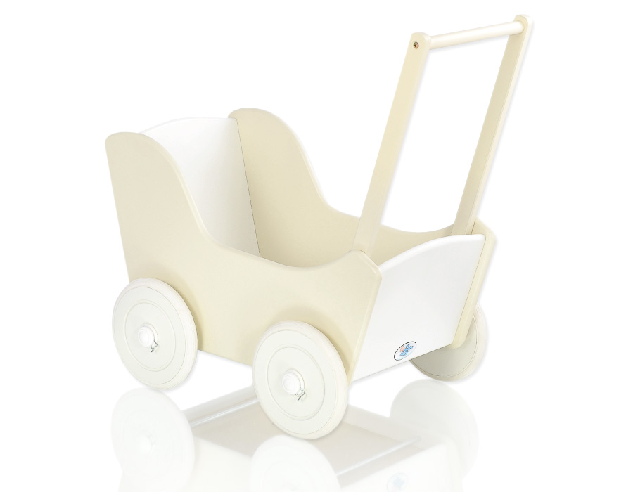 The wheels have non-slip tires that do not scratch the floor. The doll pram has an adjustable wooden handle. It can be mounted on two heights (53cm or 55cm measured from the floor).