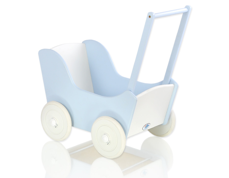 The wheels have non-slip tires that do not scratch the floor. The doll pram has an adjustable wooden handle. It can be mounted on two heights (53cm or 55cm measured from the floor).