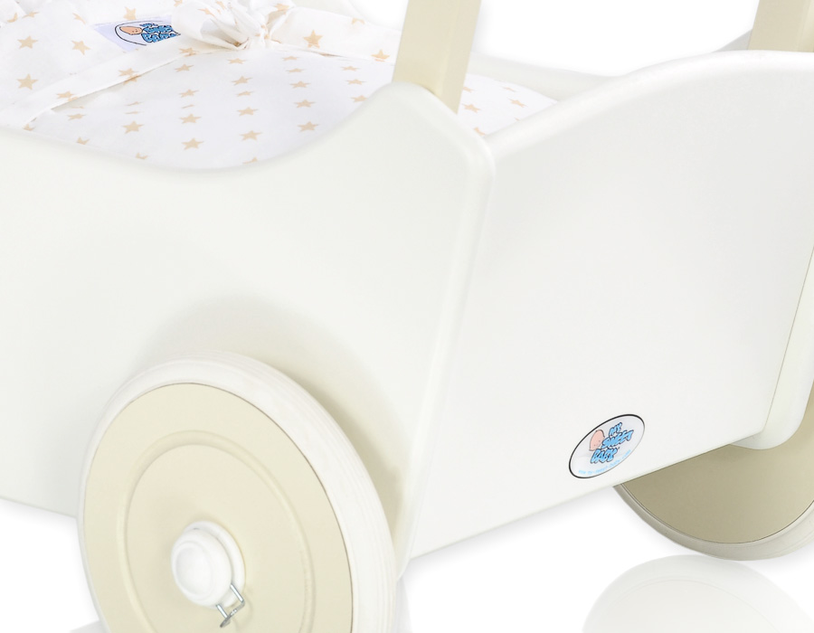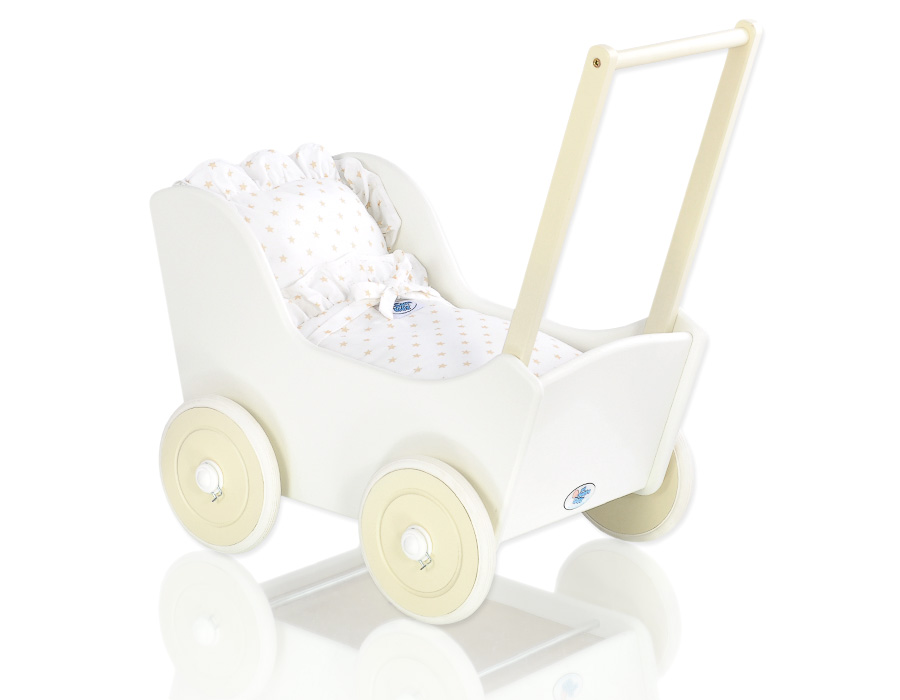 The wheels have non-slip tires that do not scratch the floor. The doll pram has an adjustable wooden handle. It can be mounted on two heights (53cm or 55cm measured from the floor).