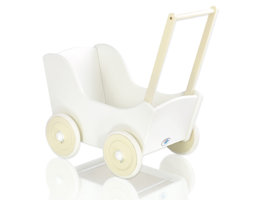 The wheels have non-slip tires that do not scratch the floor. The doll pram has an adjustable wooden handle. It can be mounted on two heights (53cm or 55cm measured from the floor).