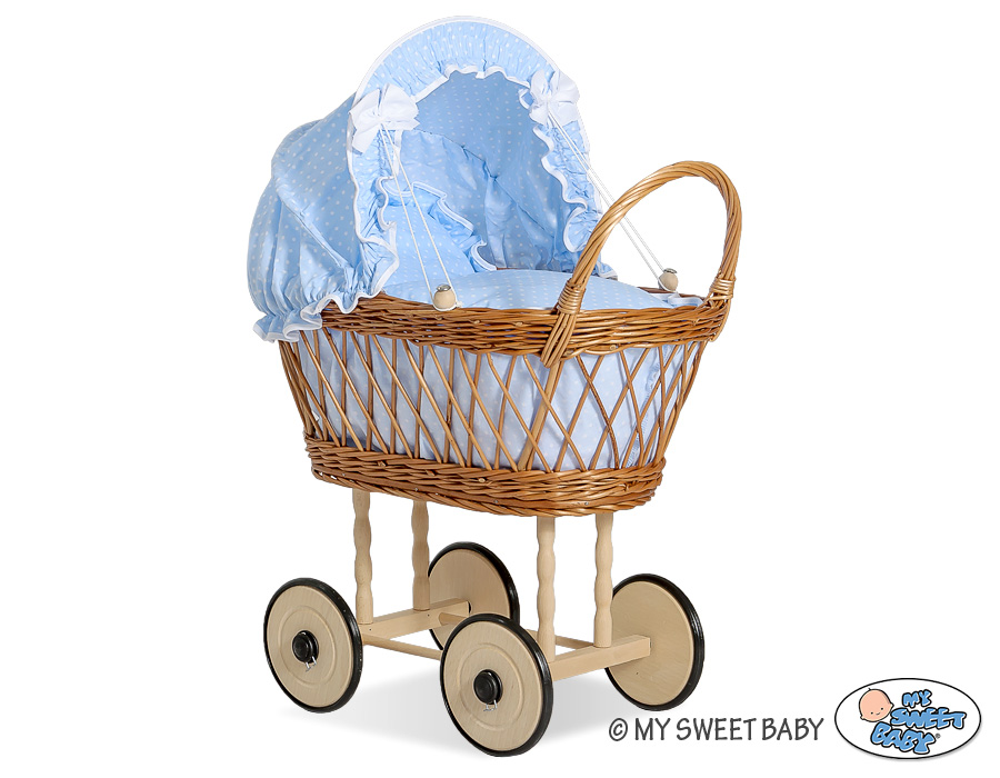 Doll pram Natural Wicker and Wood Bedding Set White Dots on Blue