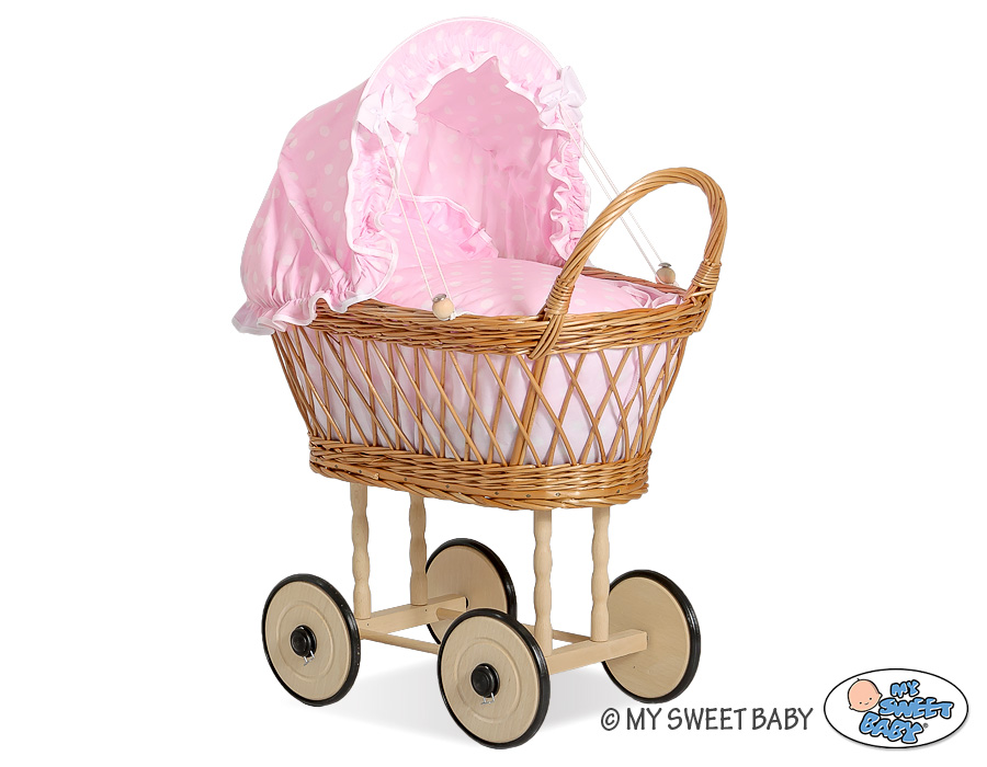 Doll pram Natural Wicker and Wood Bedding Set White Dots on Pink