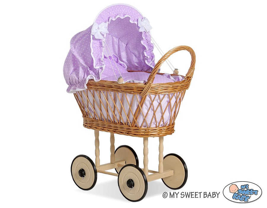 Doll pram Natural Wicker and Wood Purple with White Dots Dolls Bedding