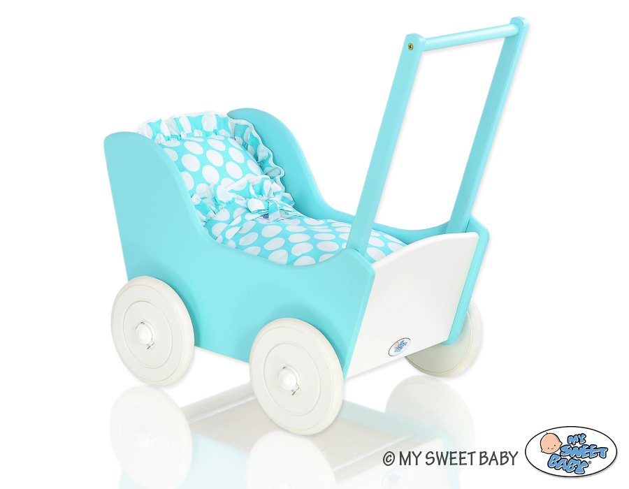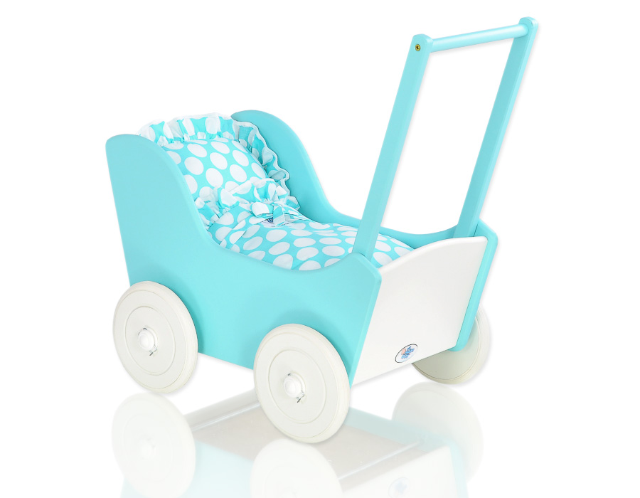 Great gift for a little girl. The doll pram is the top product for children. Made of safe materials. Painted with ecological paints. Wheels are mounted on metal axles, with a click-clack mechanism, which makes them easier to turn and do not fall.
