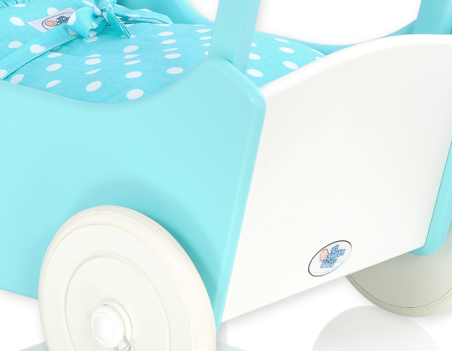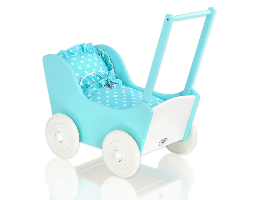 The wheels have non-slip tires that do not scratch the floor. The doll pram has an adjustable wooden handle. It can be mounted on two heights (53cm or 55cm measured from the floor).