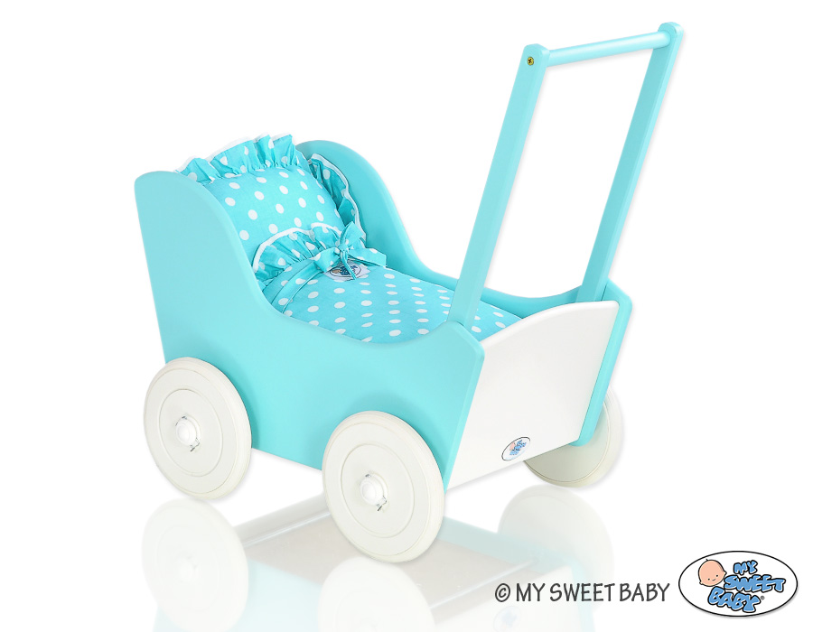 Great gift for a little girl. The doll pram is the top product for children. Made of safe materials. Painted with ecological paints. Wheels are mounted on metal axles, with a click-clack mechanism, which makes them easier to turn and do not fall.