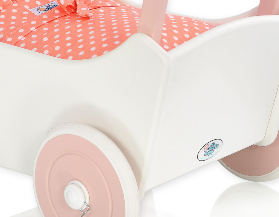 The wheels have non-slip tires that do not scratch the floor. The doll pram has an adjustable wooden handle. It can be mounted on two heights (53cm or 55cm measured from the floor).