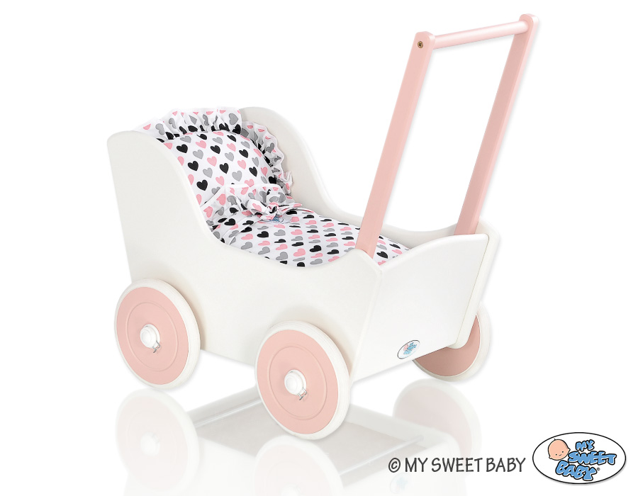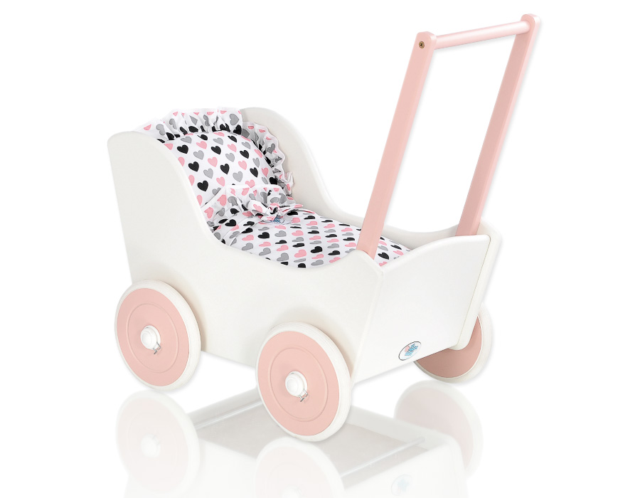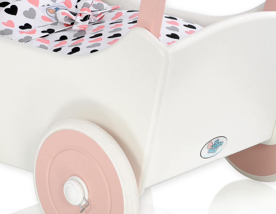 The wheels have non-slip tires that do not scratch the floor. The doll pram has an adjustable wooden handle. It can be mounted on two heights (53cm or 55cm measured from the floor).