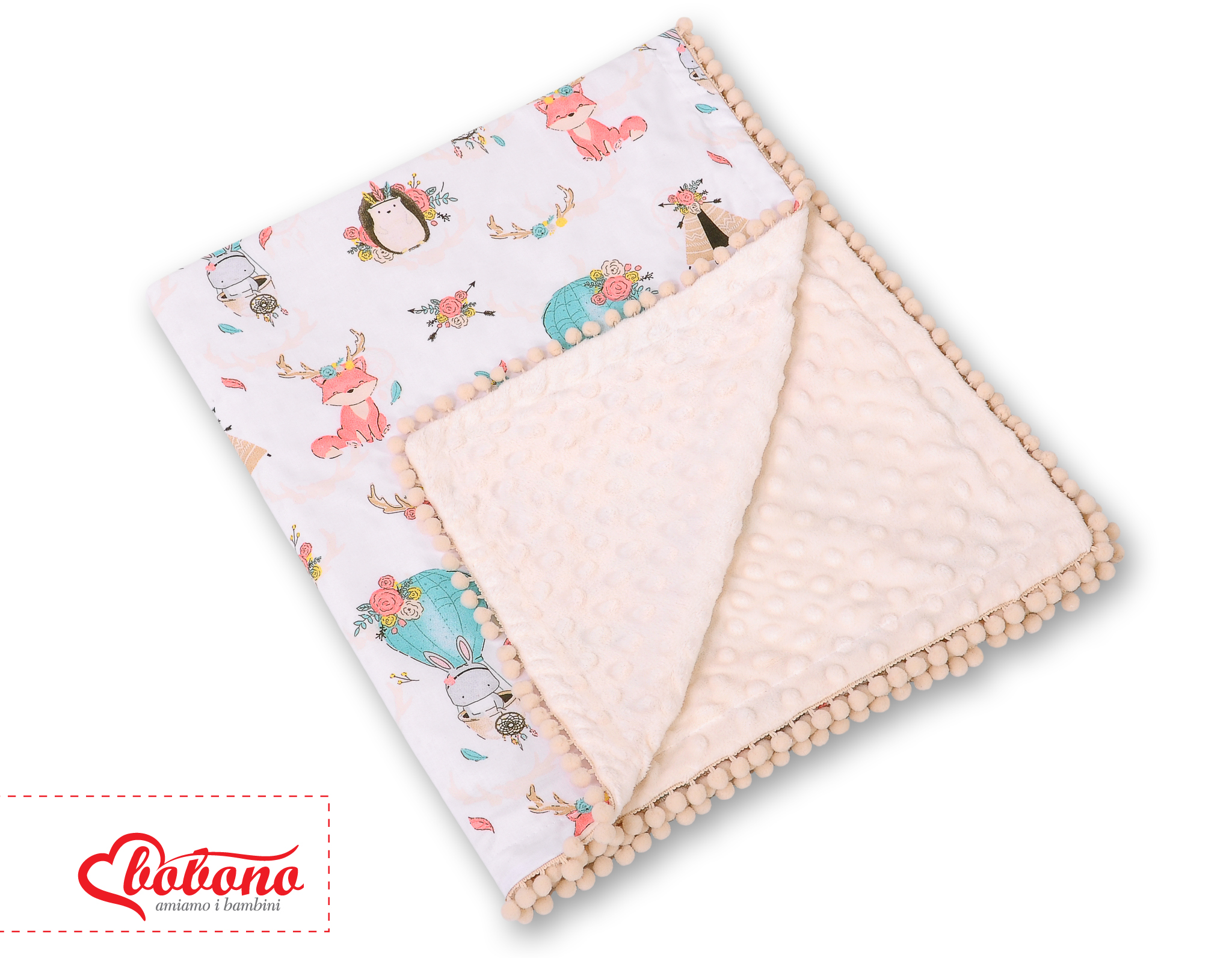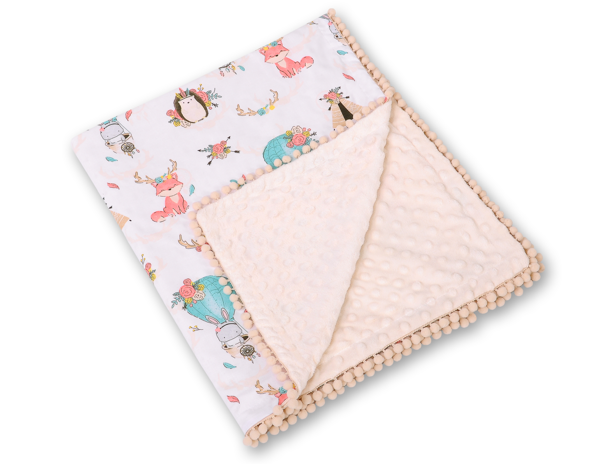 Double-sided baby blanket minky with pompoms - foxes beigeDouble-sided baby blanket minky with pompoms - foxes beige