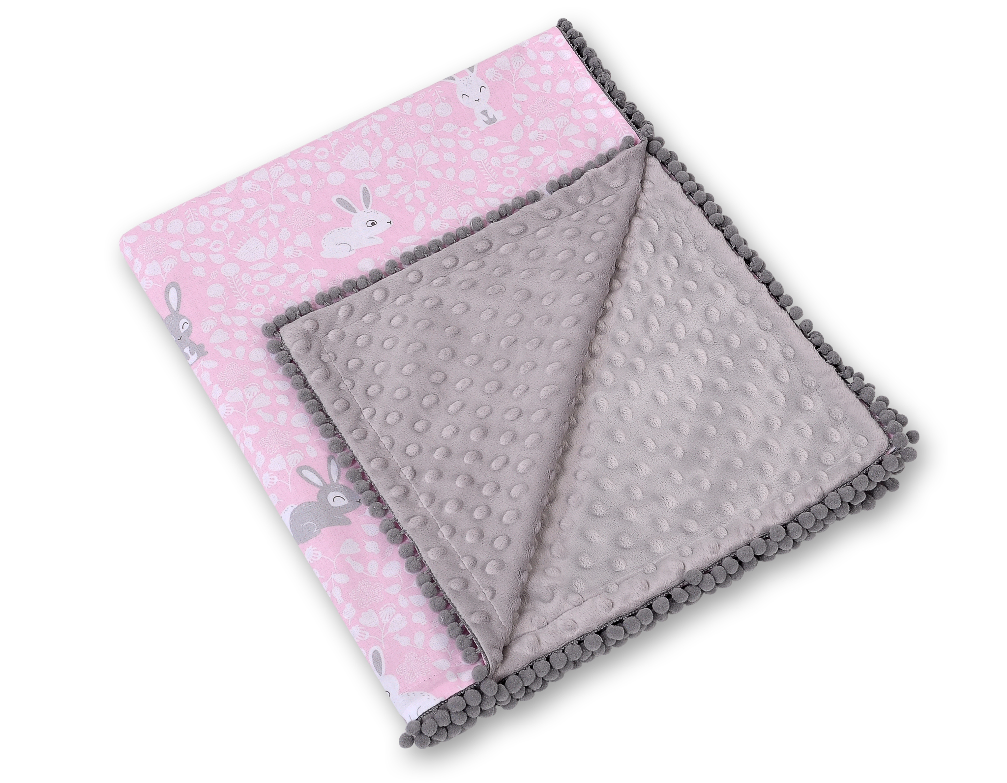 Double-sided baby blanket minky with pompoms - pink rabbits