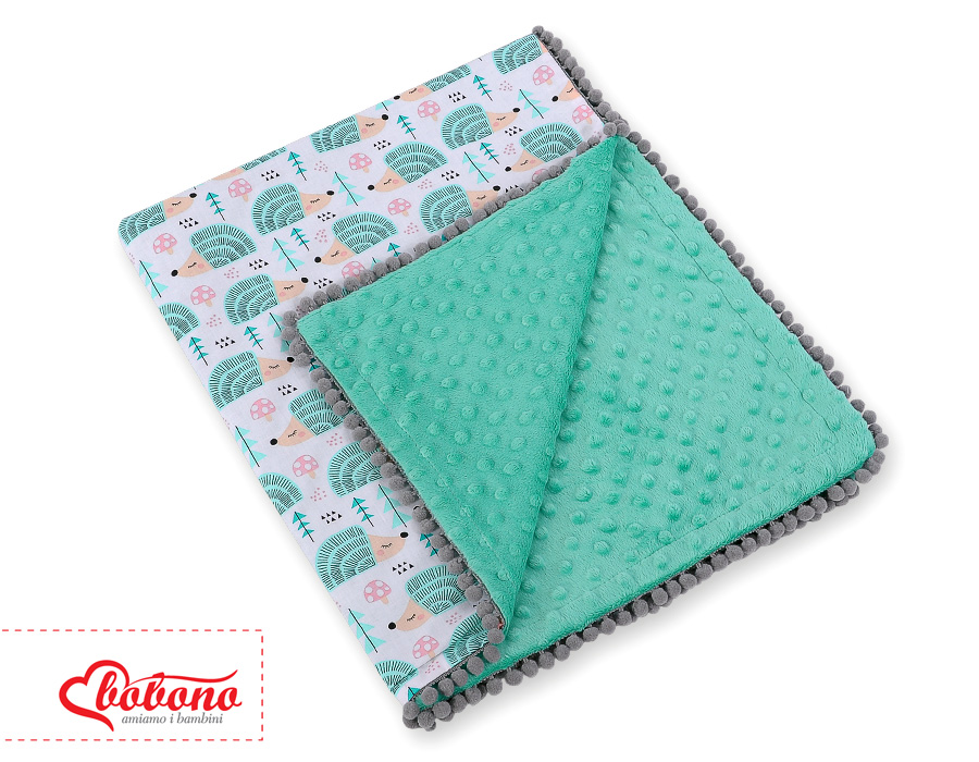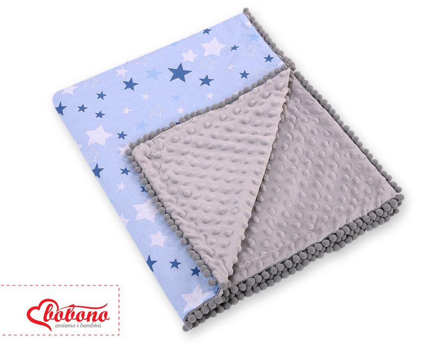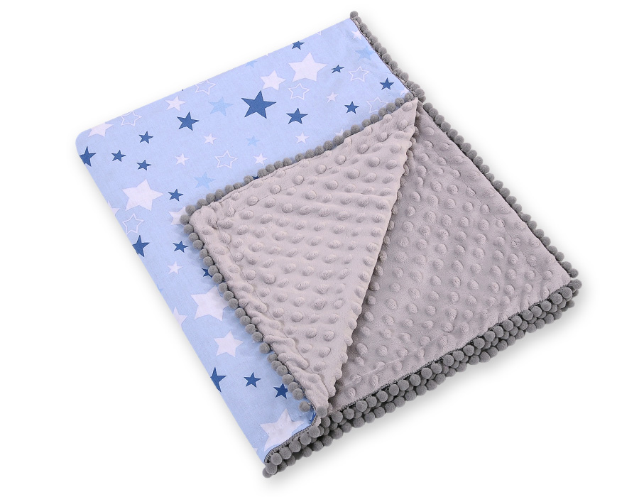 Extremely soft, comfortable baby reversible blanket with pompons. Ideal for the road and at home.