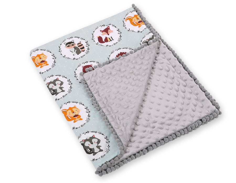 Double-sided baby blanket minky with pompons - mint animalsDouble-sided baby blanket minky with pompons - mint animals