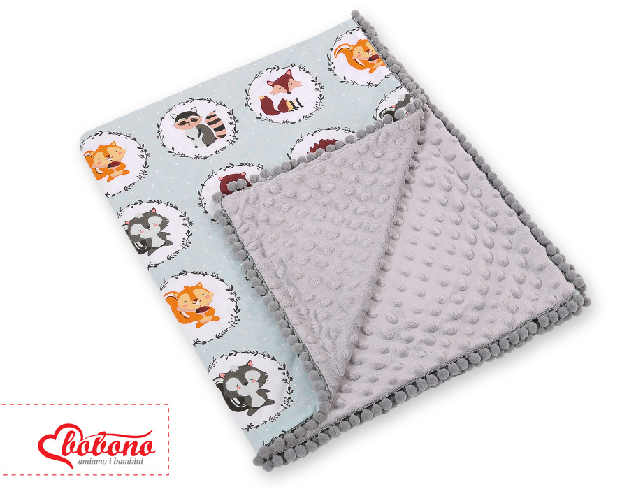 Baby Shop » Bedding sets for cots and beds » Collection FUN & JOY » Double-sided blanket minky with pompons » Double-sided baby blanket minky with pompons - mint animals