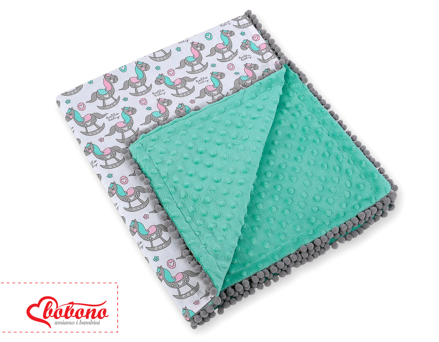 Double-sided baby blanket minky with pompons - rocking horsesDouble-sided baby blanket minky with pompons - rocking horses