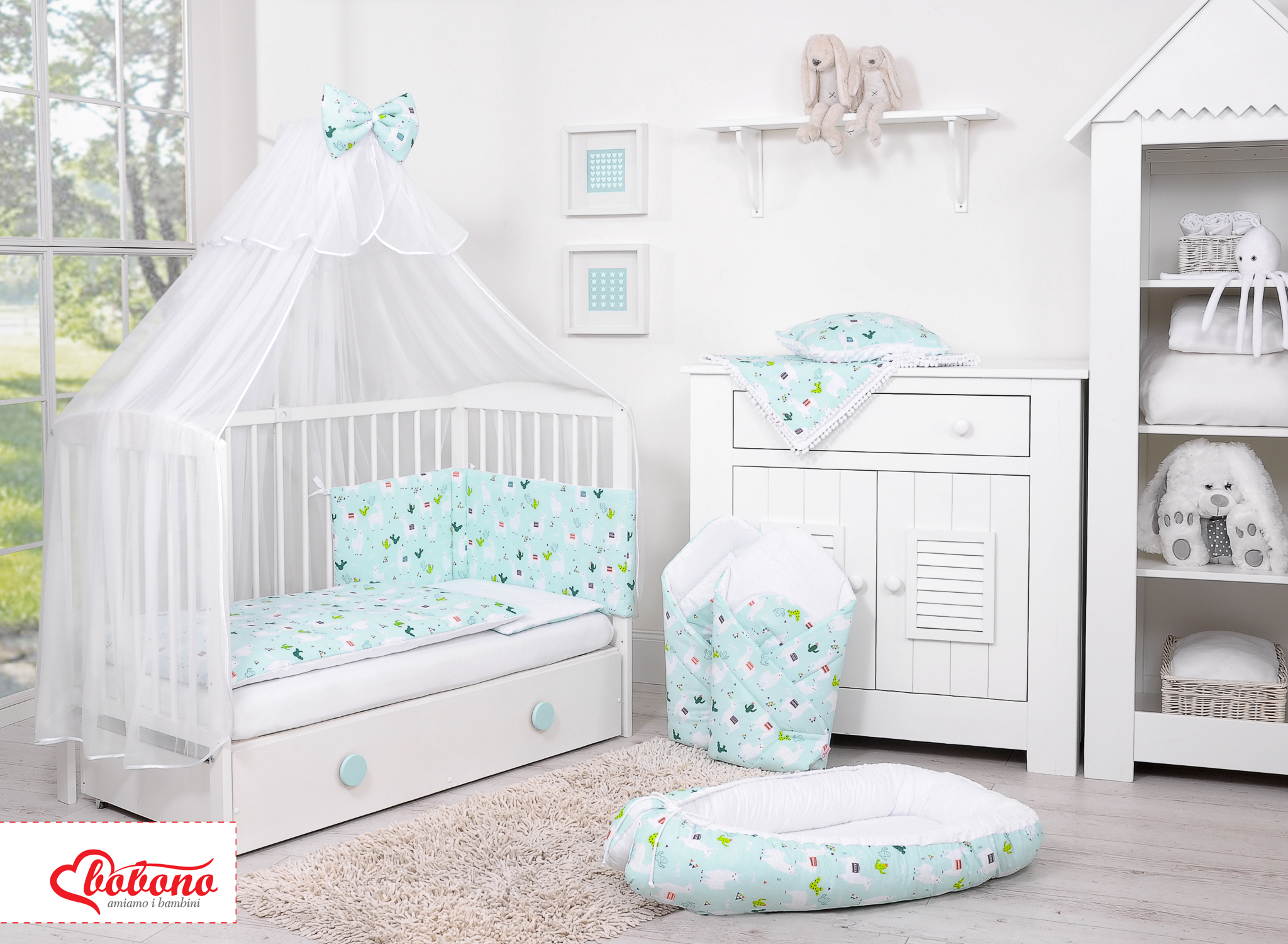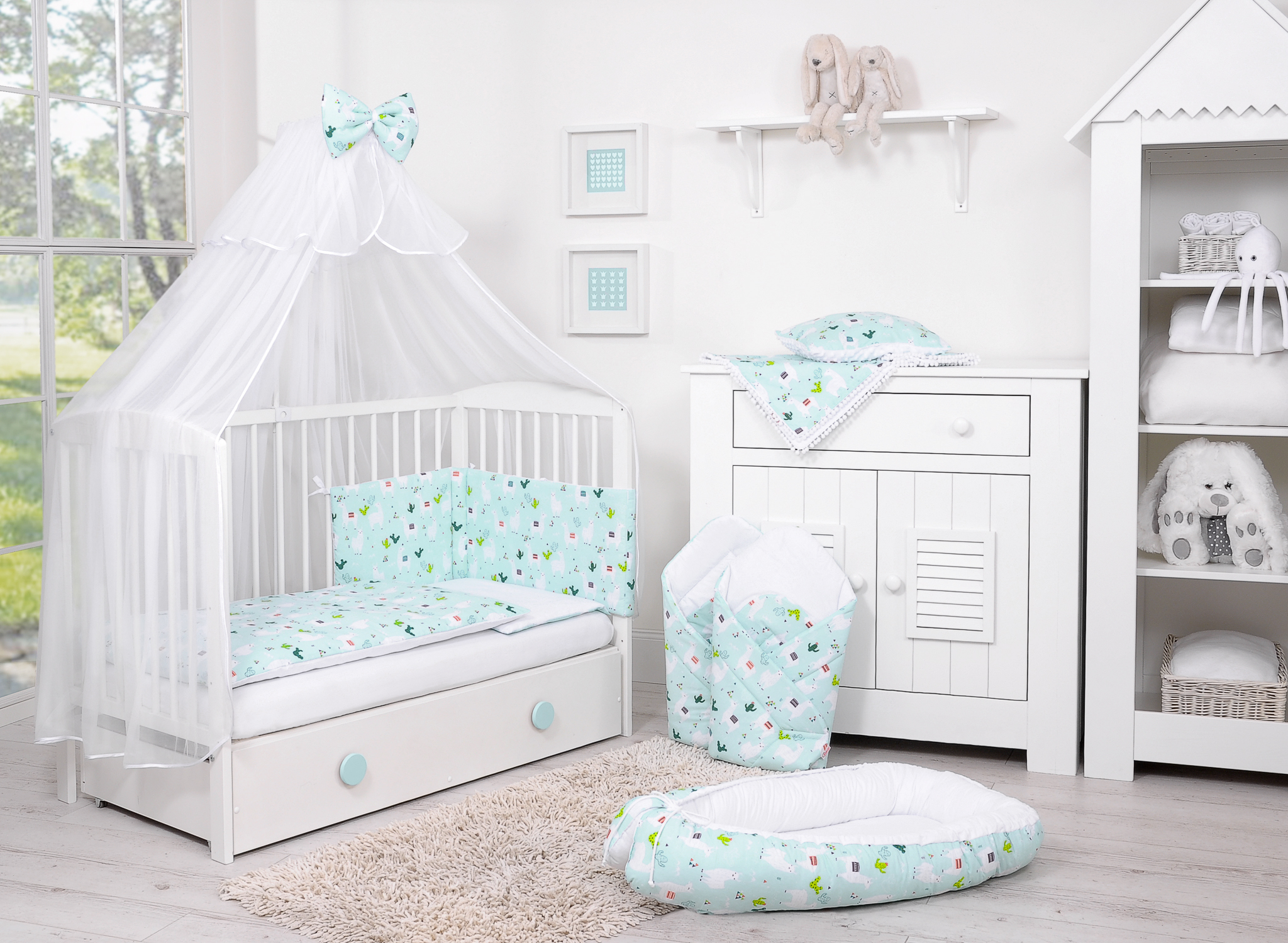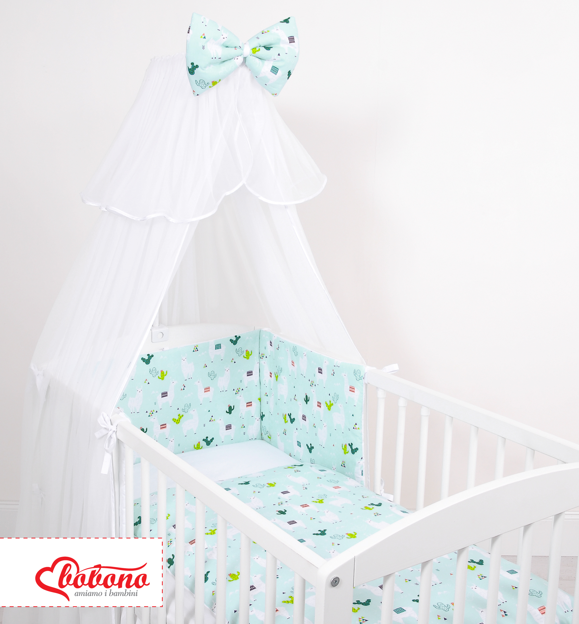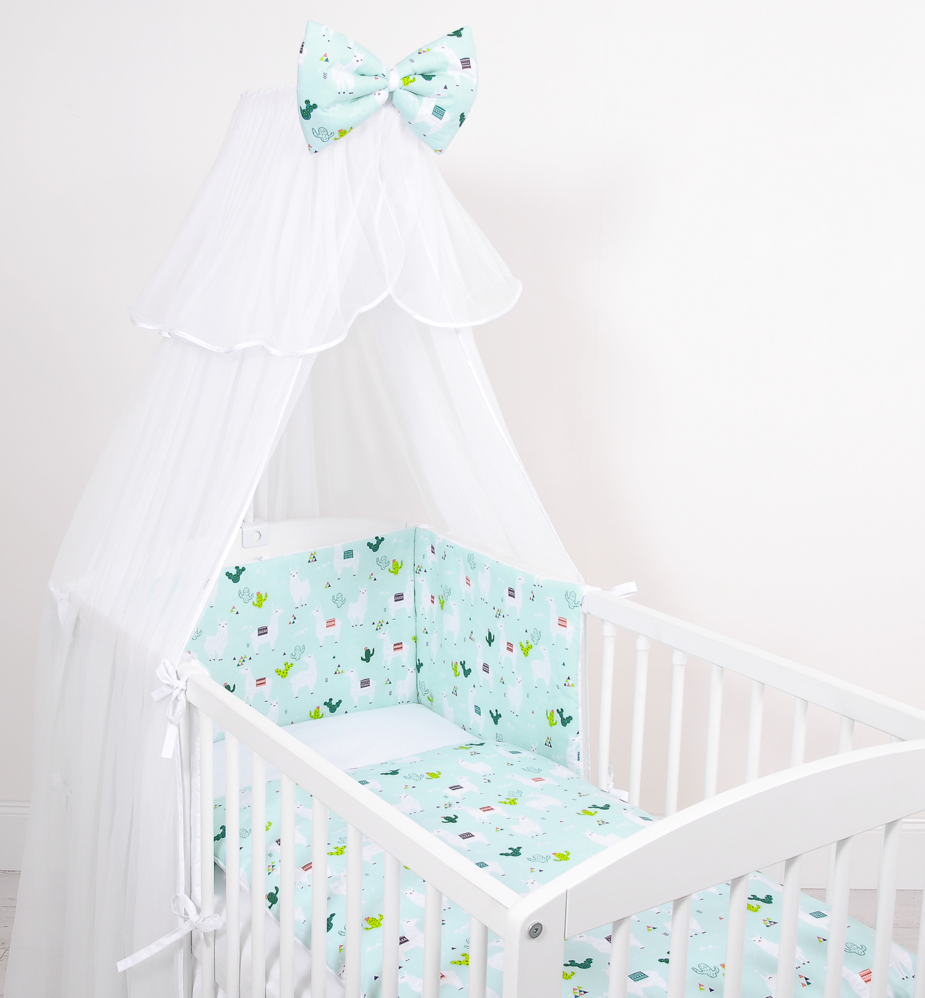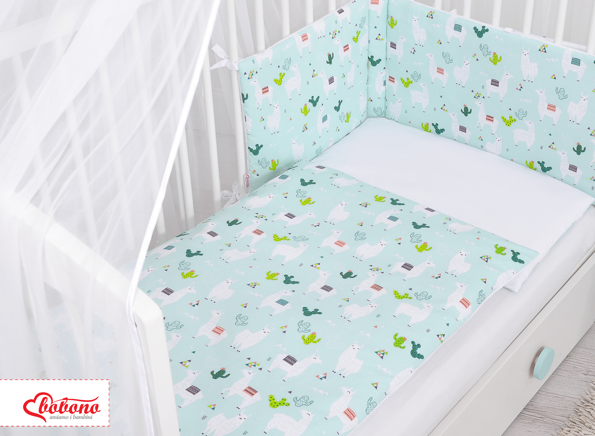 Double-sided bedding set 5-pcs with mosquito-net - lama mint/white In the colorful bedding, spends the child a quiet night. High quality made of cotton.
