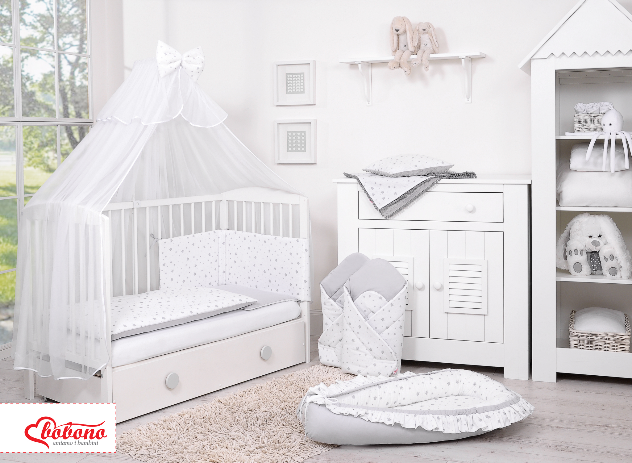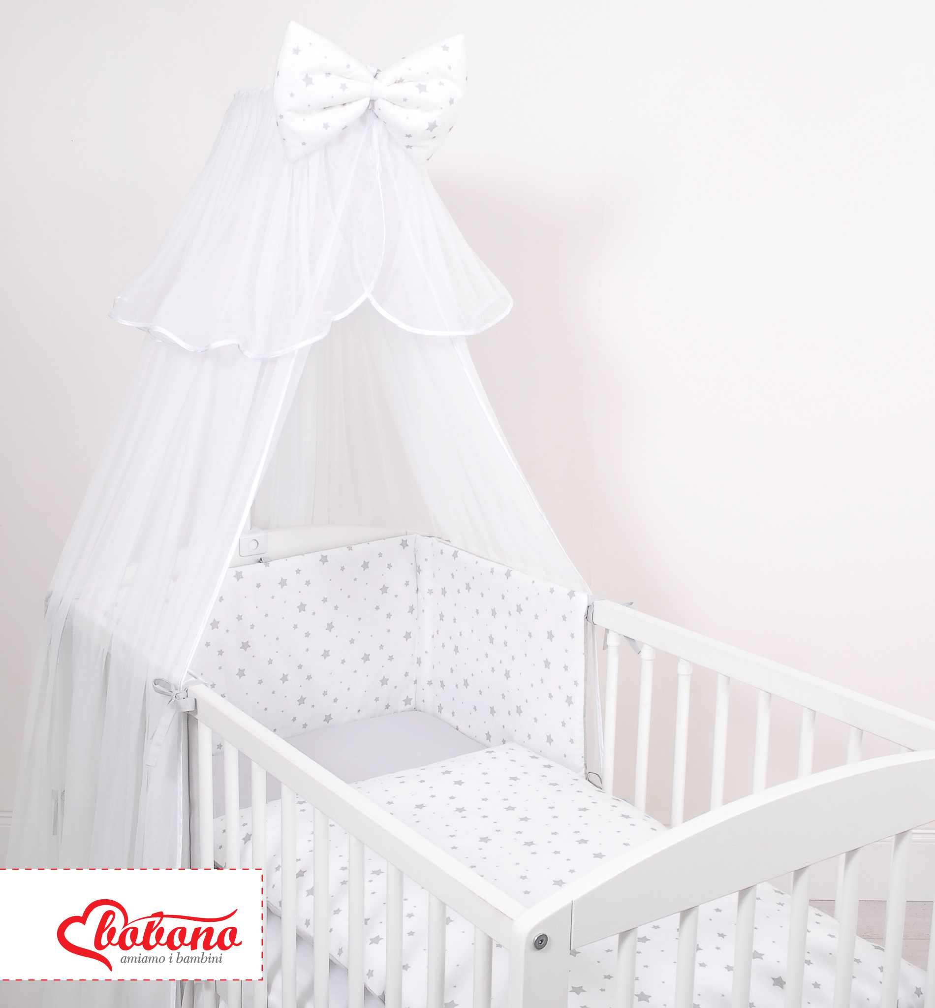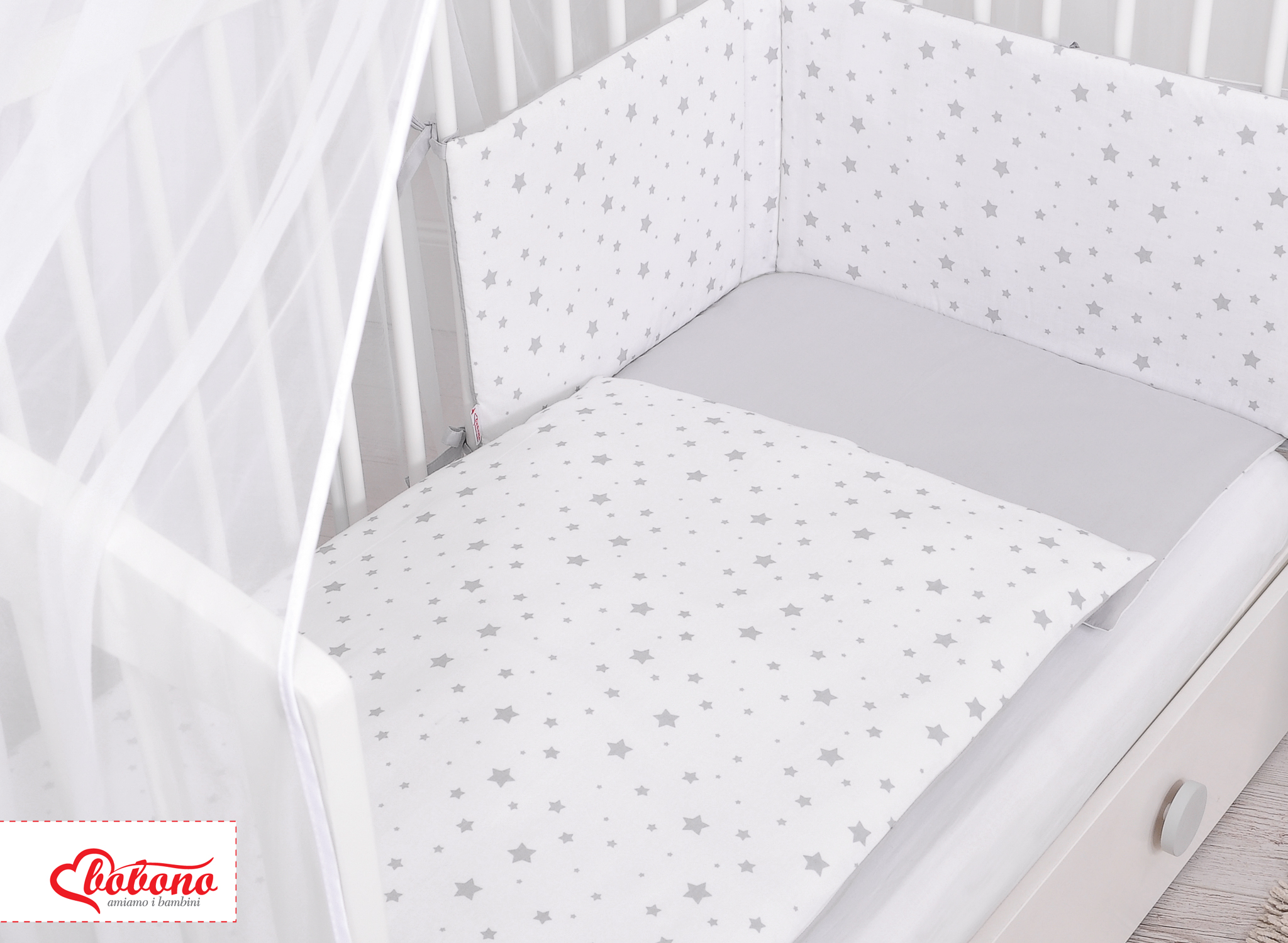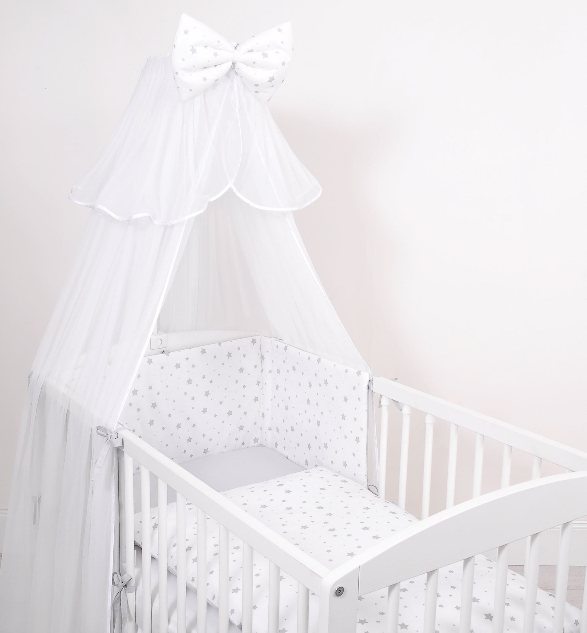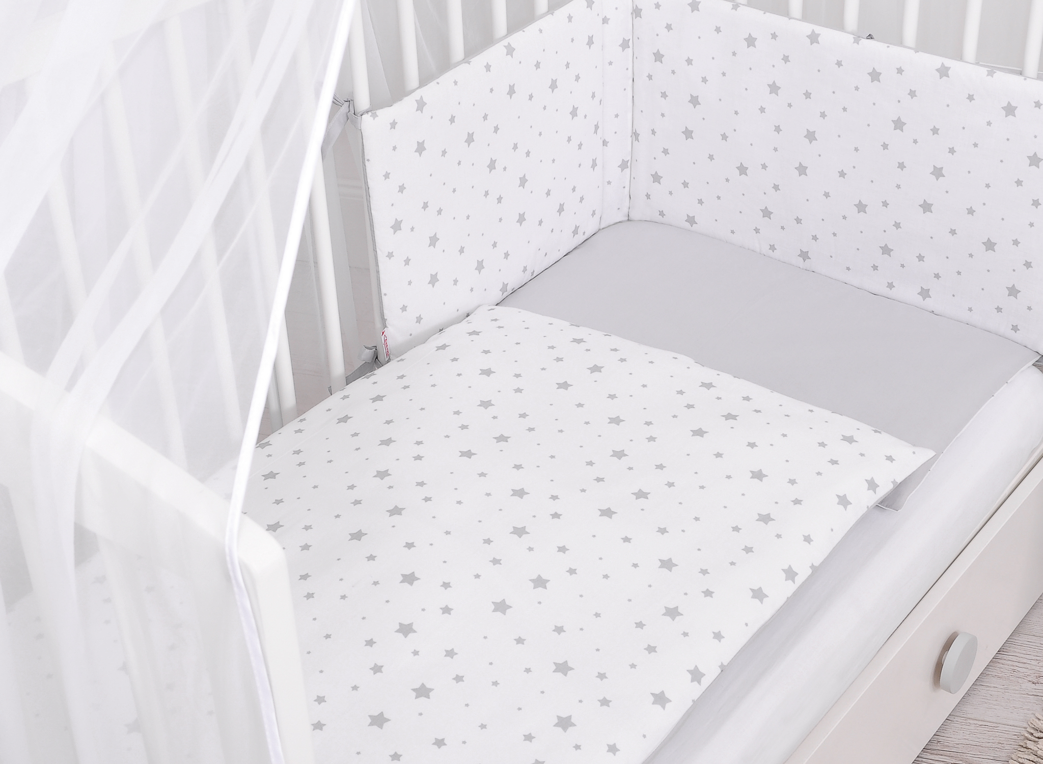 Double-sided bedding set 5-pcs with mosquito-net - mini gray stars/gray In the colorful bedding, spends the child a quiet night. High quality made of cotton.