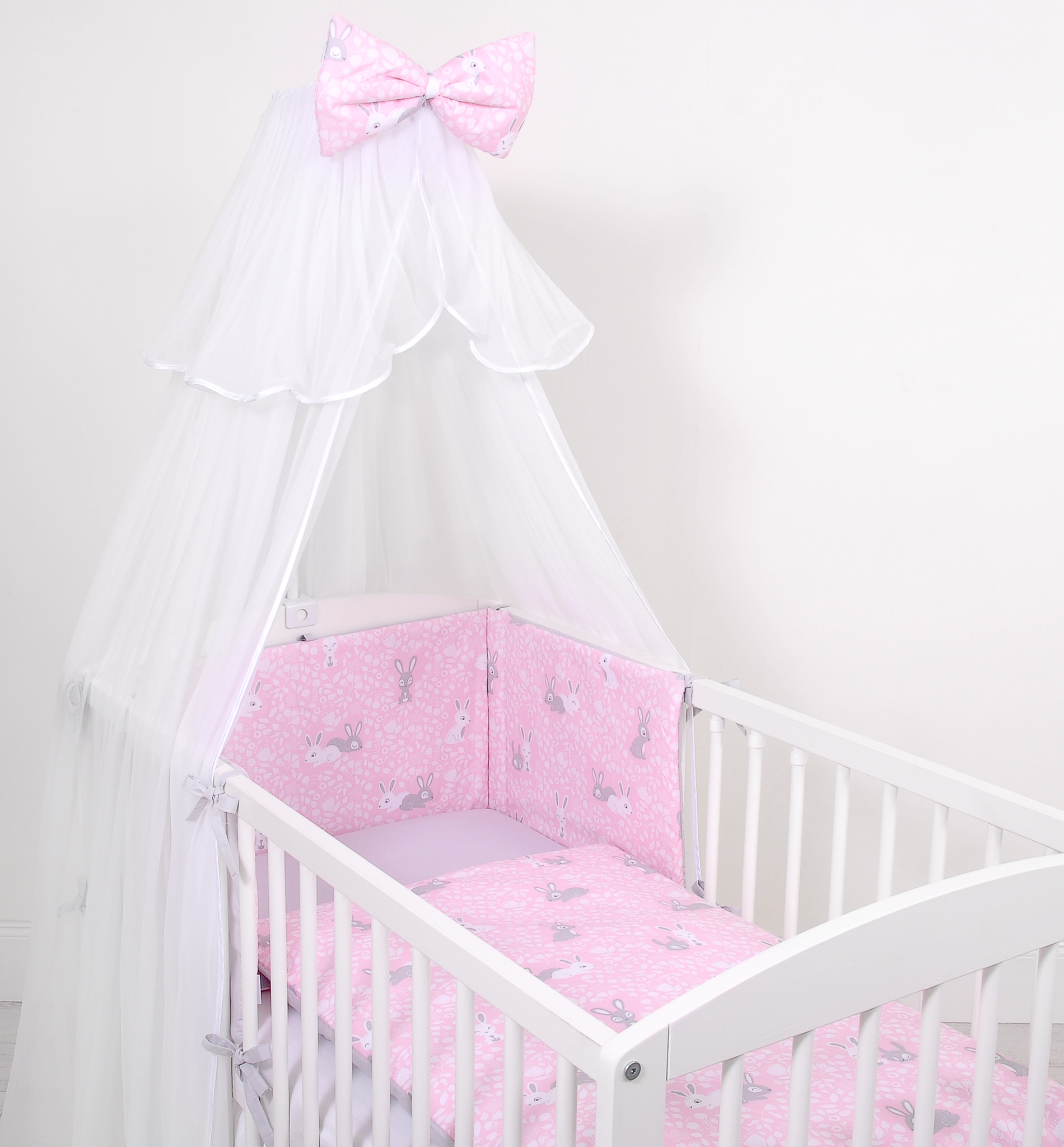1. Pillow cover 40x60cm (fabric 100% cotton). 2. Duvet cover 90x120cm or 100x135cm (fabric 100% cotton). 3. Bumper with applications 32x152cm (outer fabric 100% cotton, padding 100% Polyester). 4. Mosquito-net made of Chiffon (470x160cm) 5. Decorative Bow.