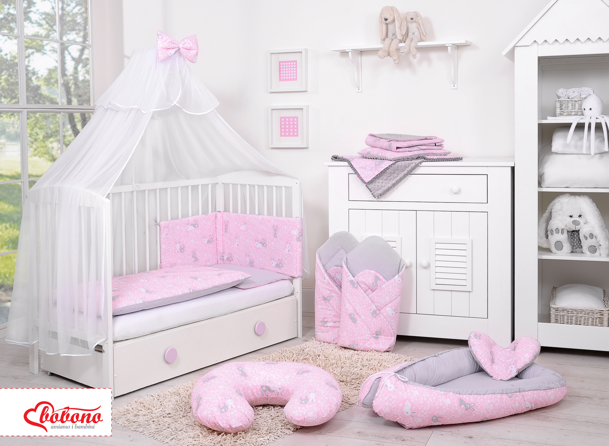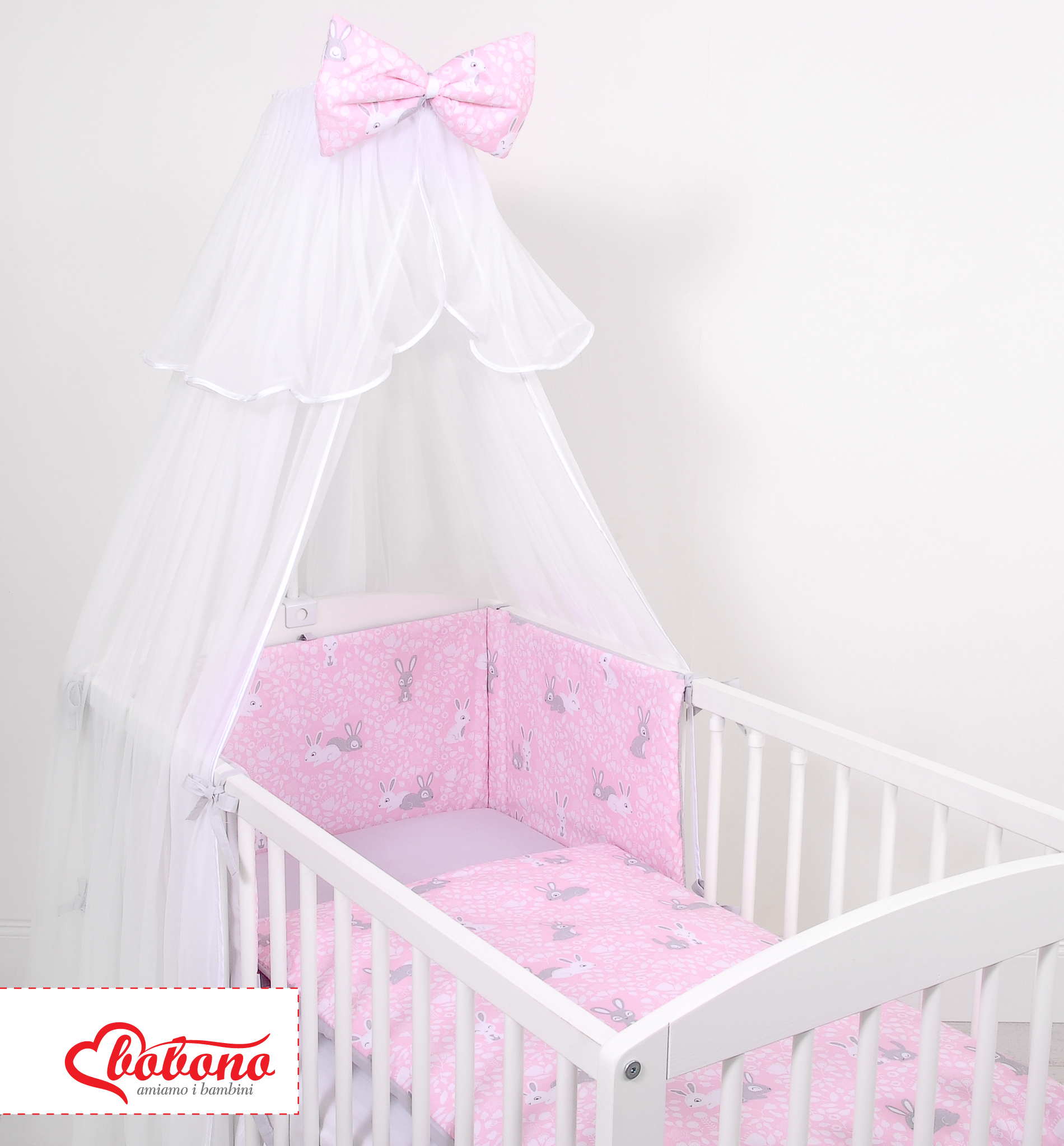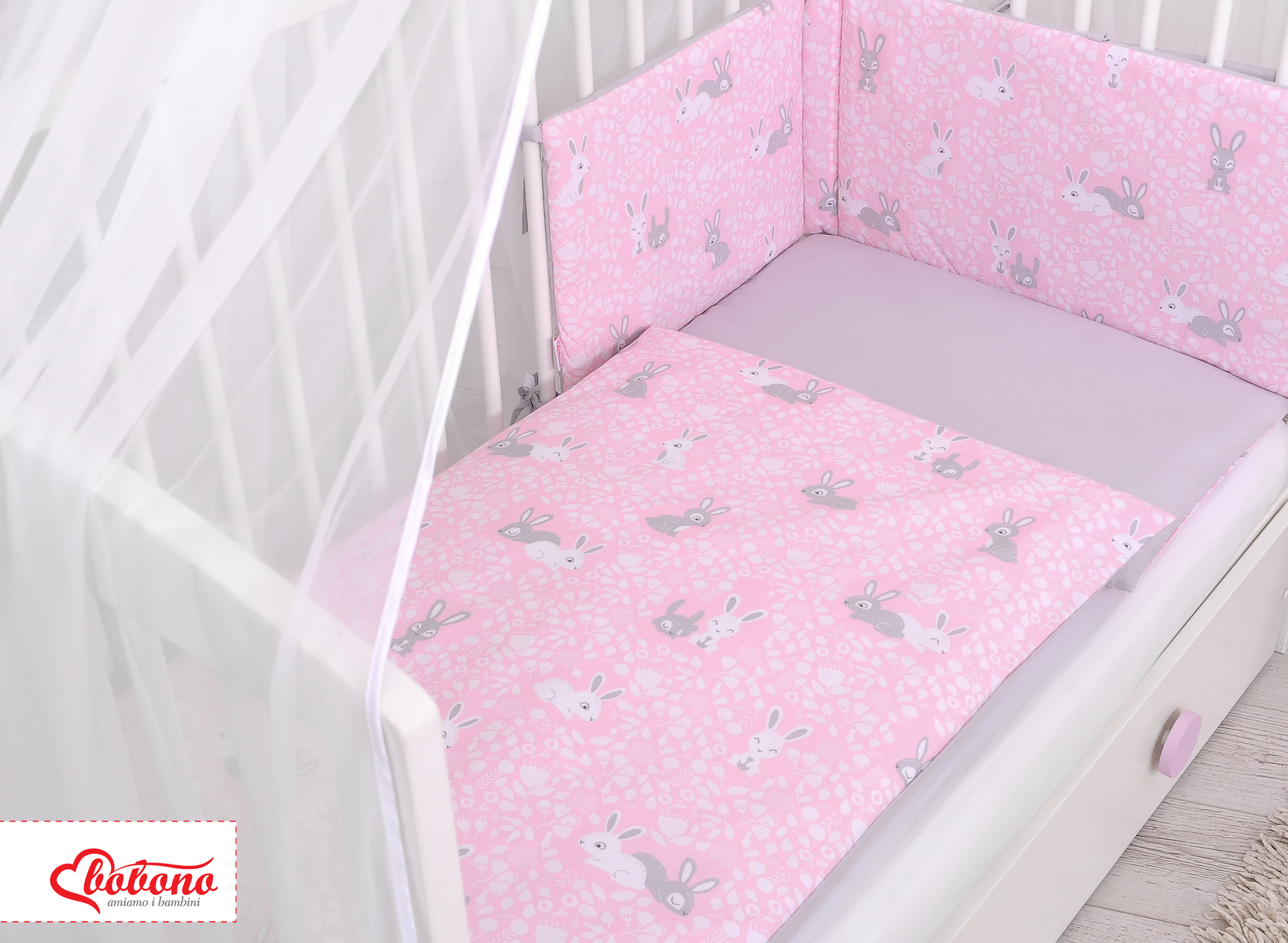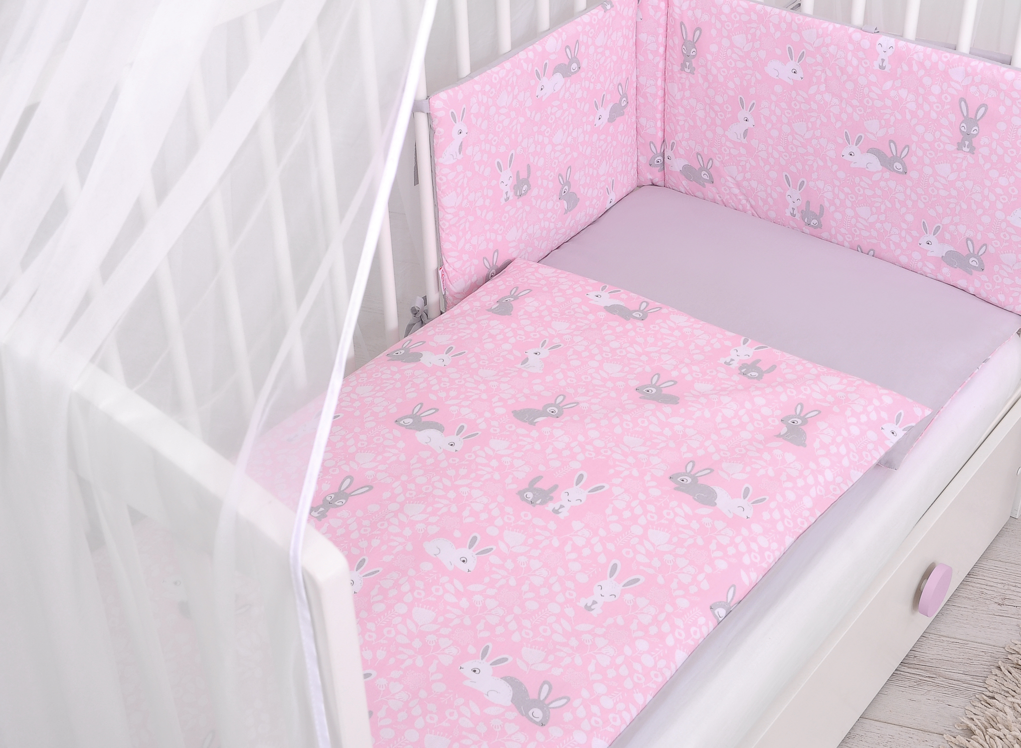 Double-sided bedding set 5-pcs with mosquito-net - pink rabbits/gray In the colorful bedding, spends the child a quiet night. High quality made of cotton.