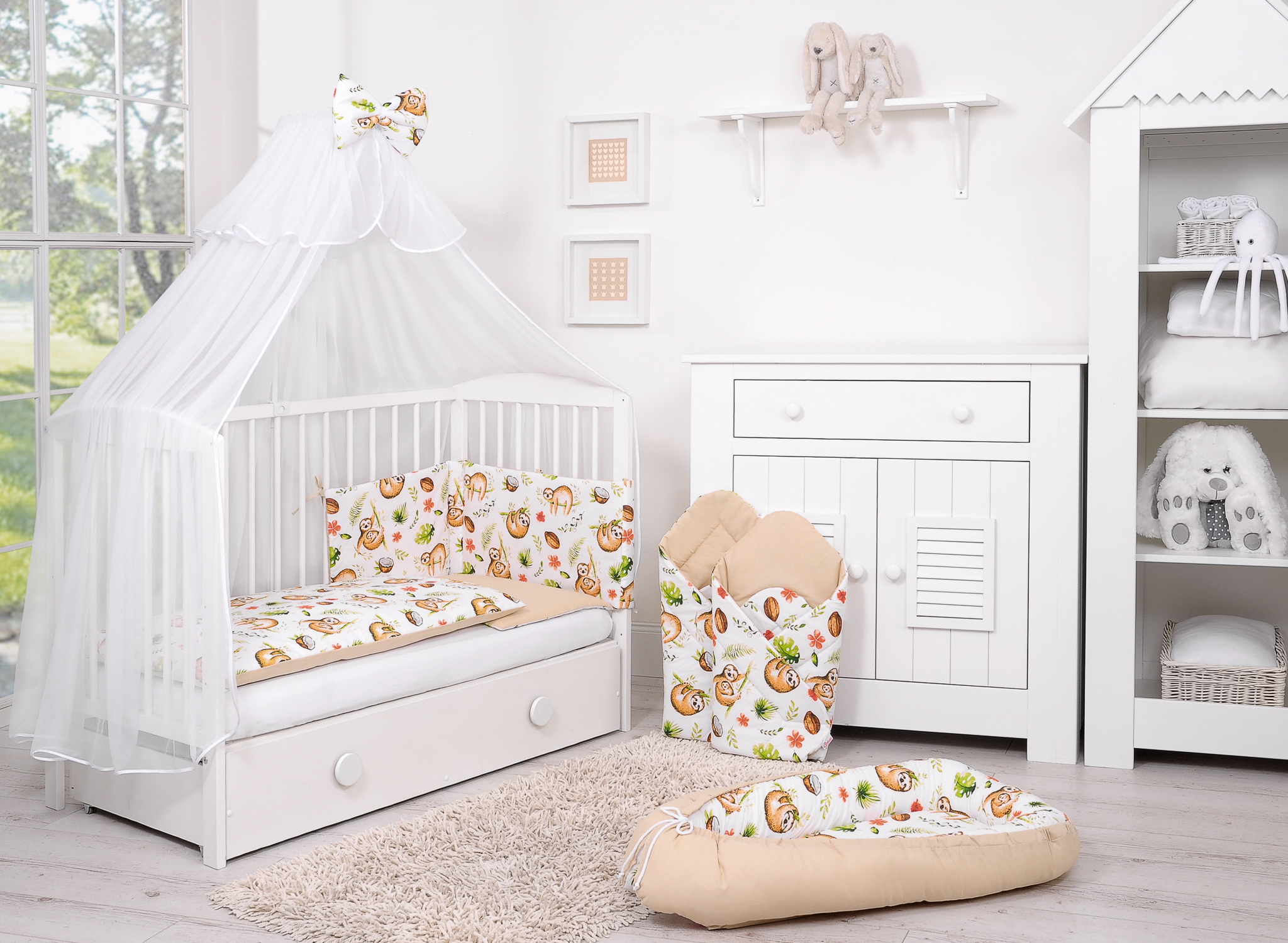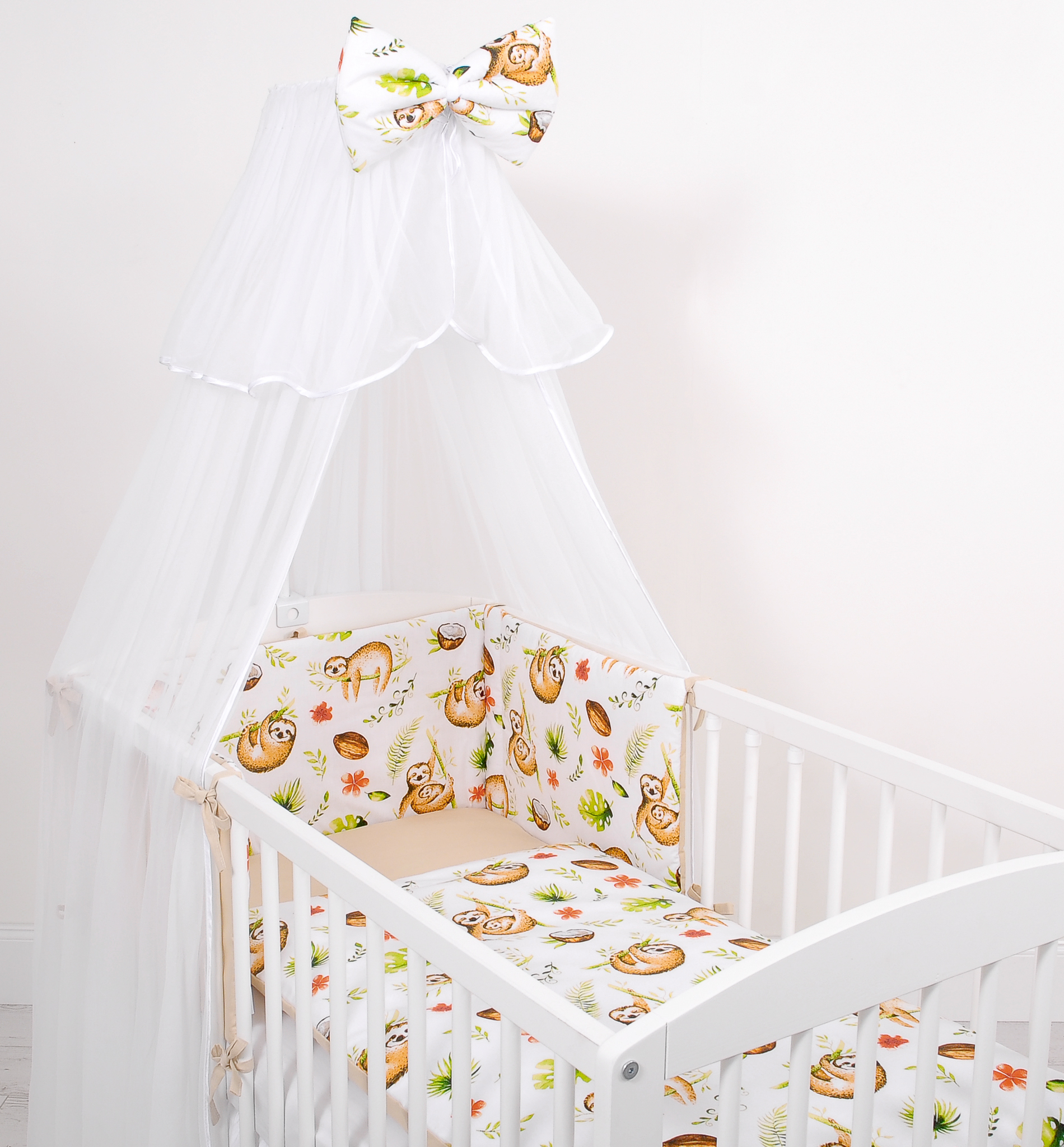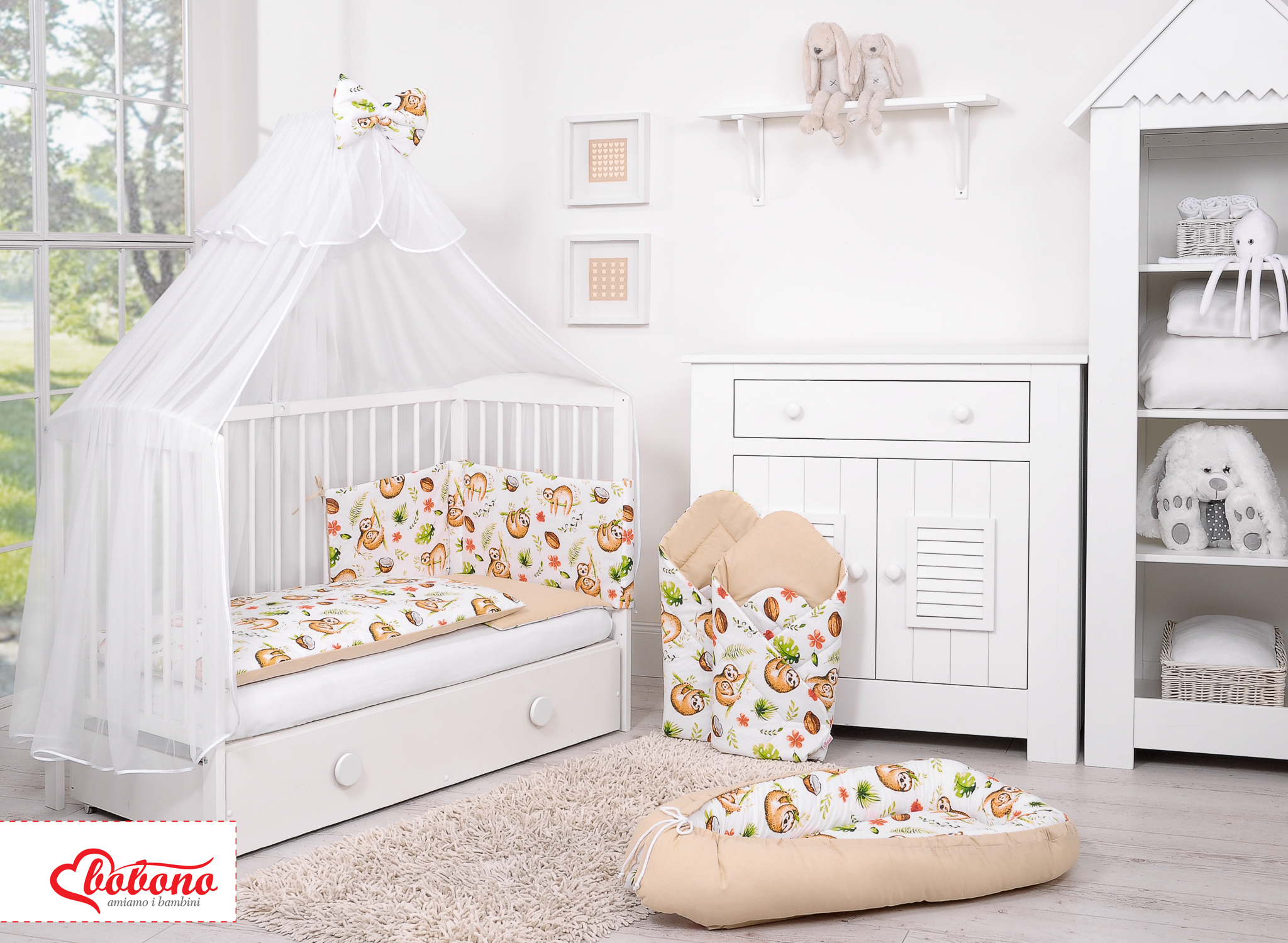 Double-sided bedding set 5-pcs with mosquito-net - sloths beige/beige In the colorful bedding, spends the child a quiet night. High quality made of cotton.
