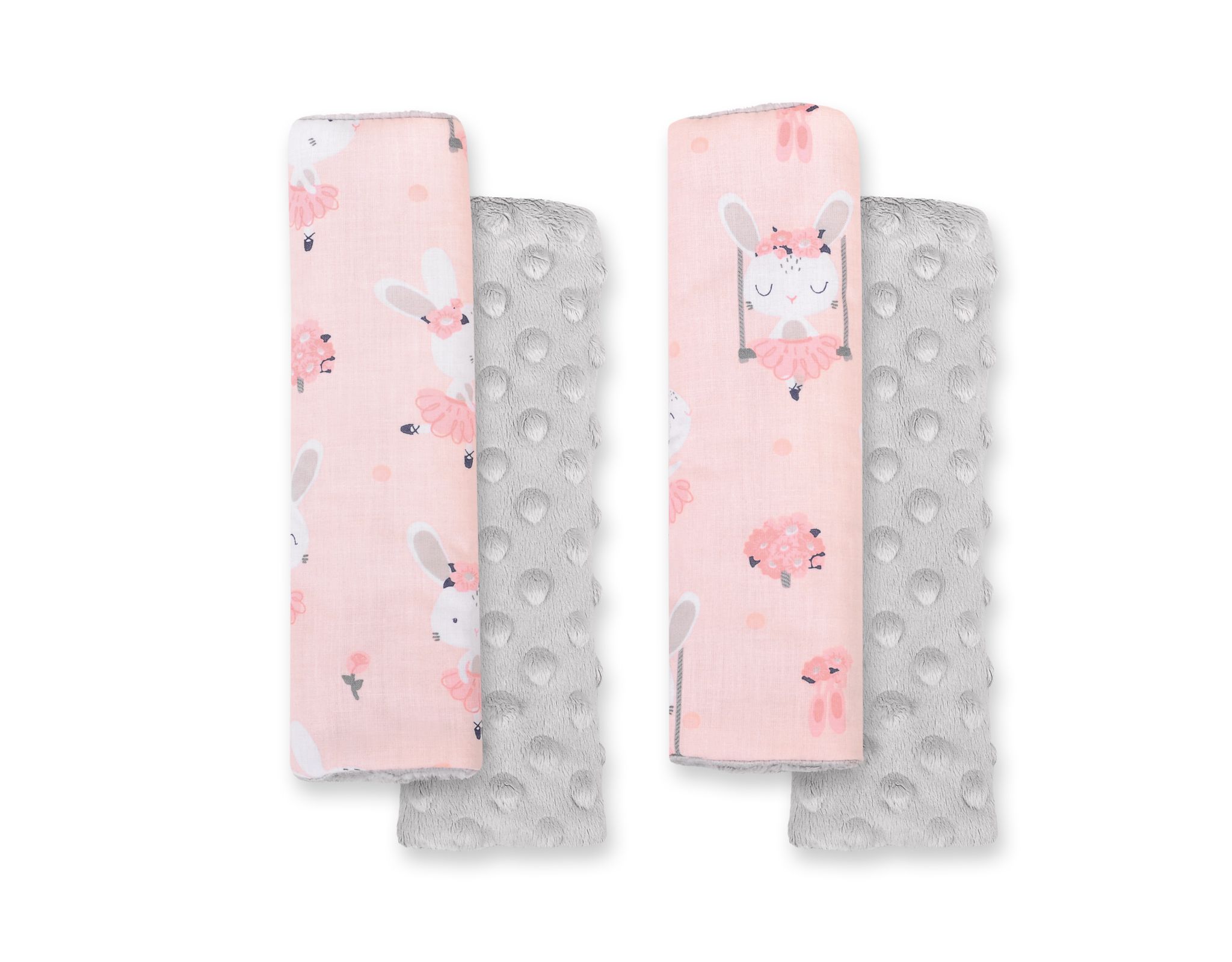 Made of 100% cottton and nice in touch fleece “minky”. They are zipped with velcro closure so it is easy wrap them round seat belt keeping child comfortably.