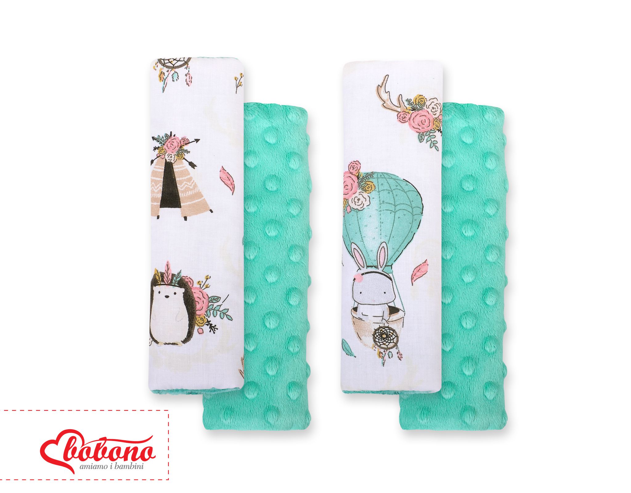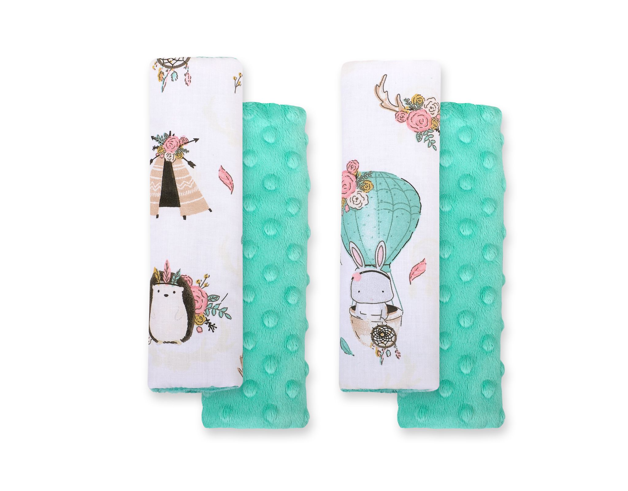 Made of 100% cottton and nice in touch fleece “minky”. They are zipped with velcro closure so it is easy wrap them round seat belt keeping child comfortably.