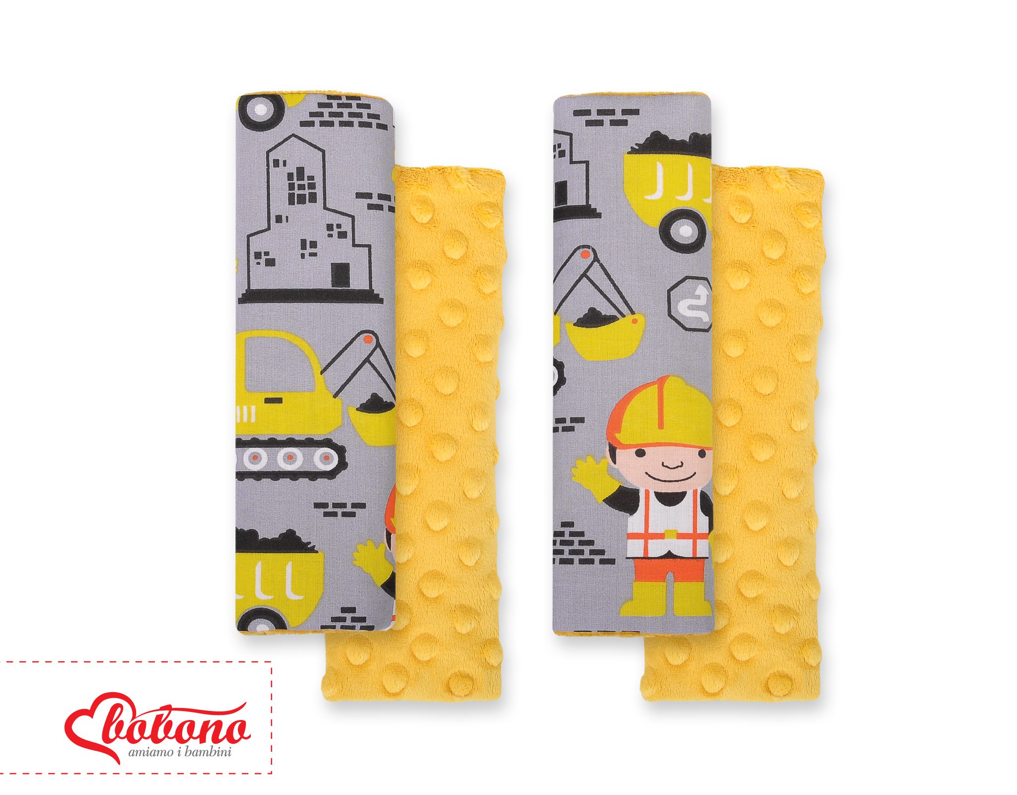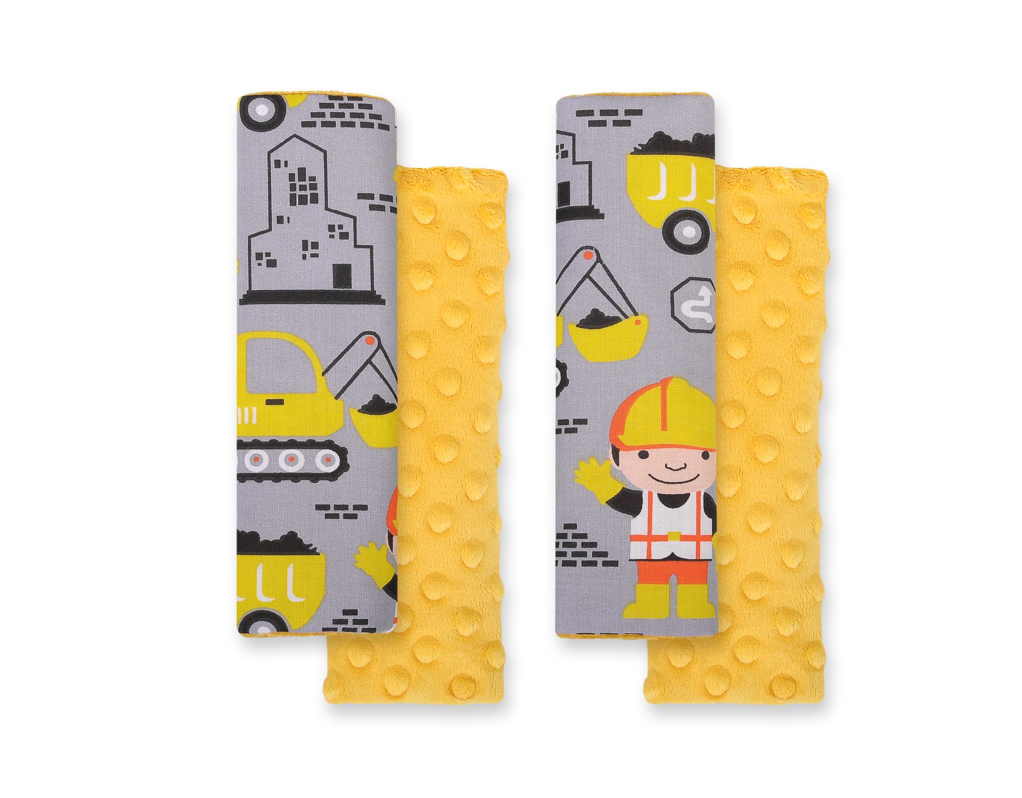 Made of 100% cottton and nice in touch fleece “minky”. They are zipped with velcro closure so it is easy wrap them round seat belt keeping child comfortably.