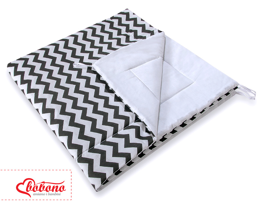 Double-sided teepee playmat- Chevron black Double-sided playmat for teepee tent. She can be used inside, outside and in the garden. The blanket cover is from the same material as teepee play tent and therefore suits perfect to our teepee play tent. In the production of the play mat only natural materials are used. The fabric is made from 100% cotton and Oeko-Tex 100 certified. The blanket can be washed in the washing machine (30°C).