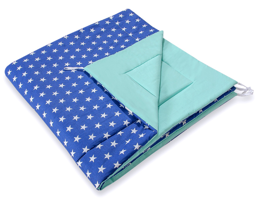 Double-sided teepee playmat- Stars navy blue Double-sided playmat for teepee tent. She can be used inside, outside and in the garden. The blanket cover is from the same material as teepee play tent and therefore suits perfect to our teepee play tent. In the production of the play mat only natural materials are used. The fabric is made from 100% cotton and Oeko-Tex 100 certified. The blanket can be washed in the washing machine (30°C).