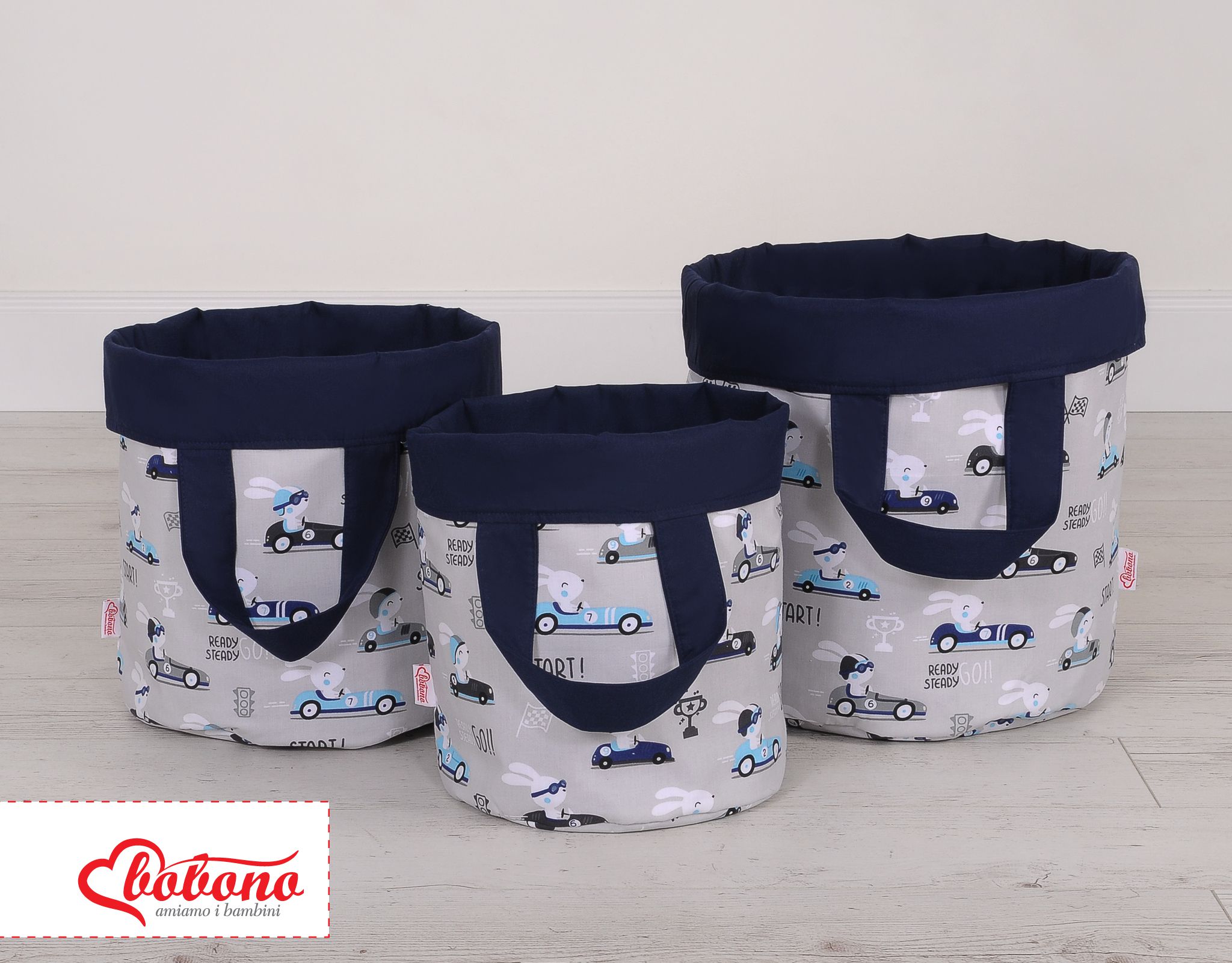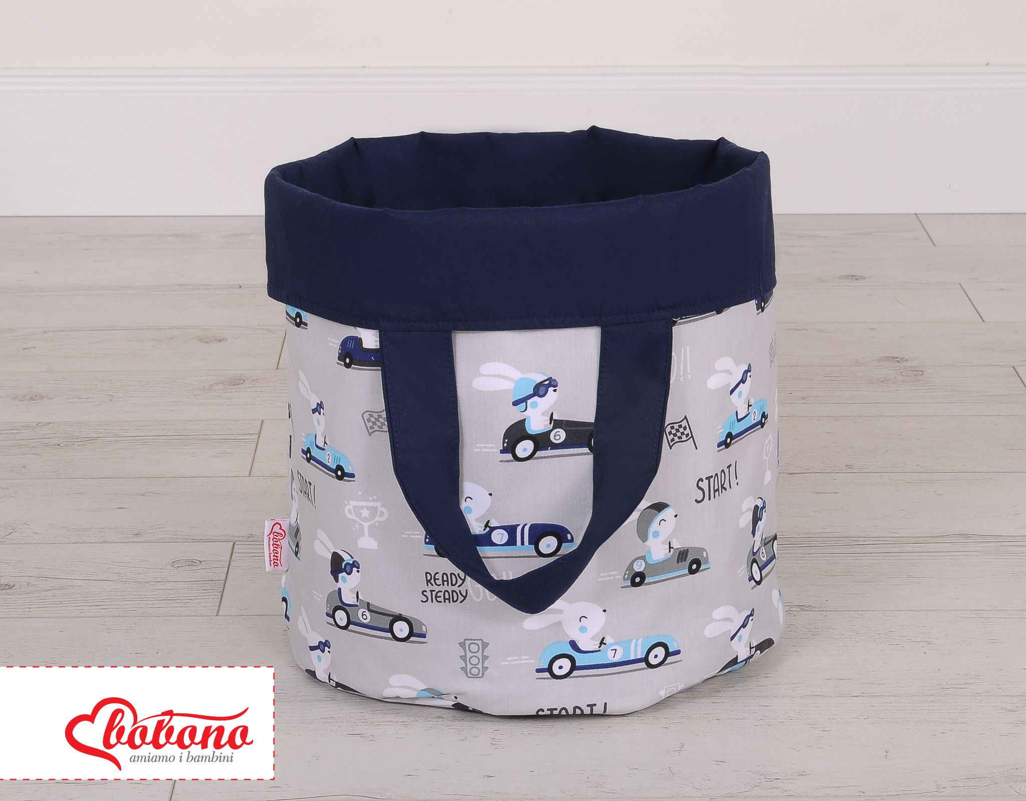 Double-sided toy basket L - gray rabbits/dark blue