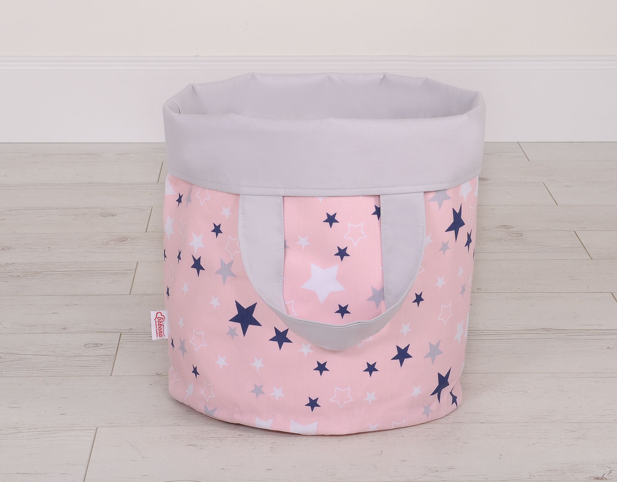 Double-sided toy basketSolid handles that makes carrying things easier. The perfect solution to keep the children's room in order. Very spacious, light and safe. Made of 100% cotton. Inside filled with a layer of fleece. A fashionable and practical decoration accessory of every baby's room.