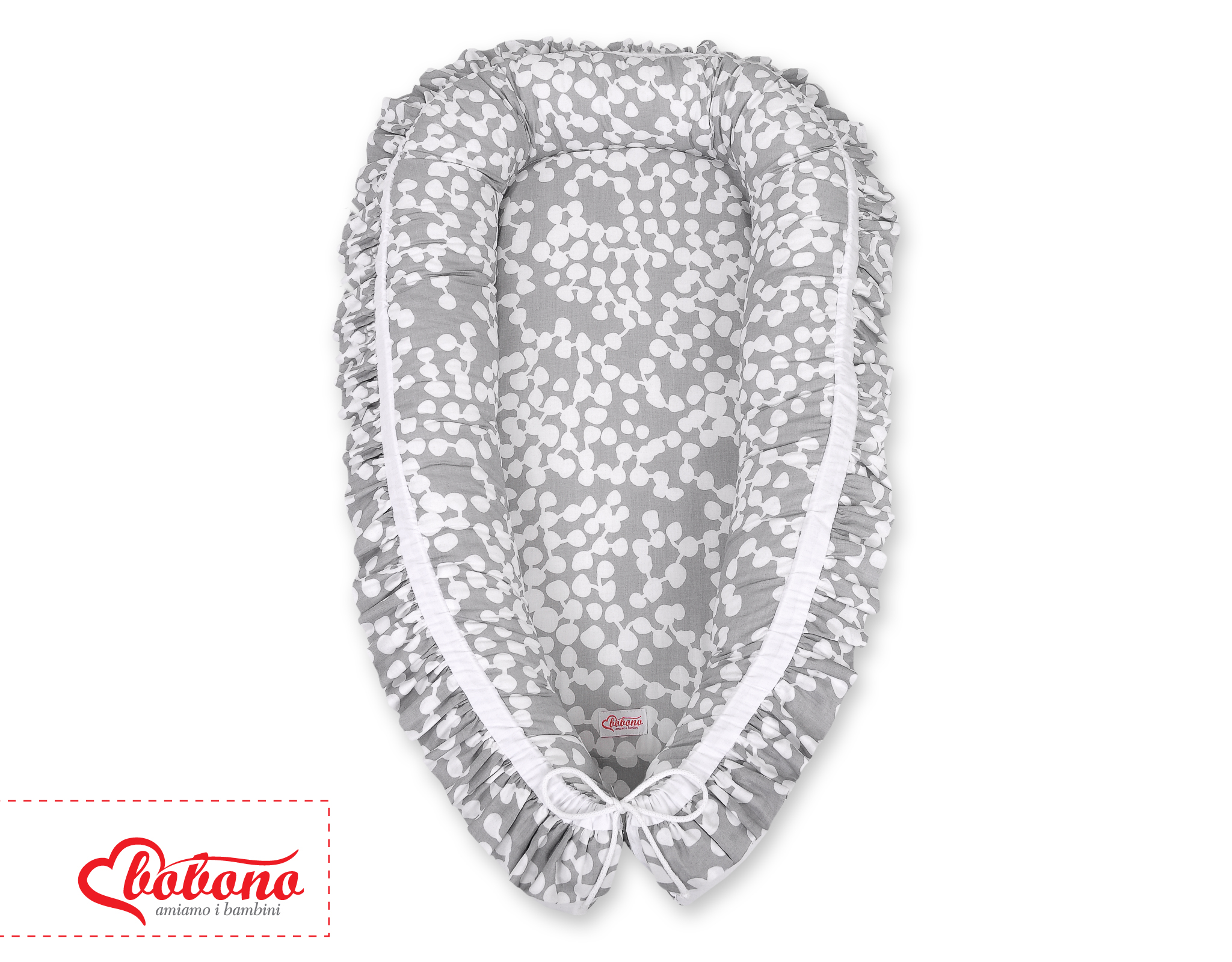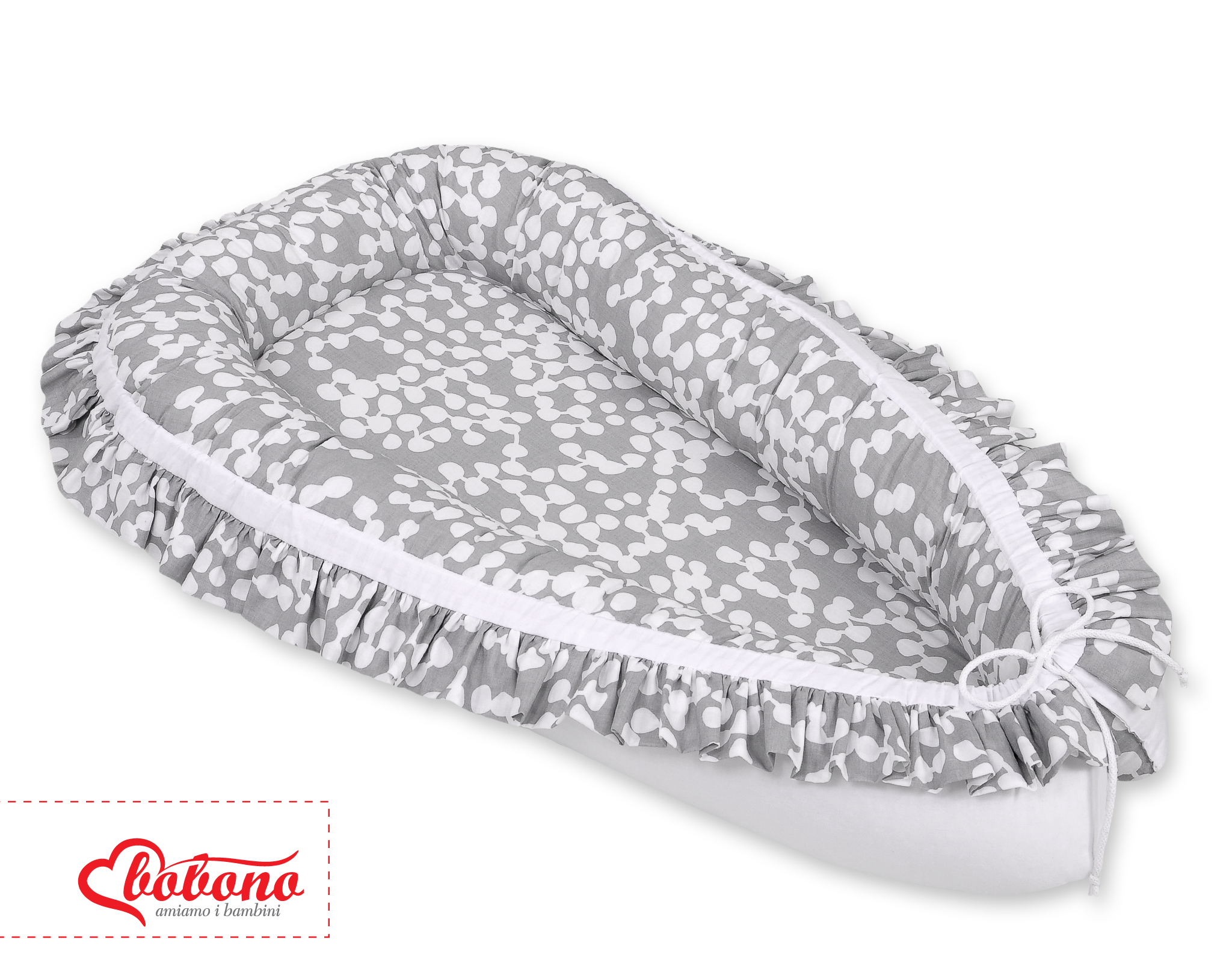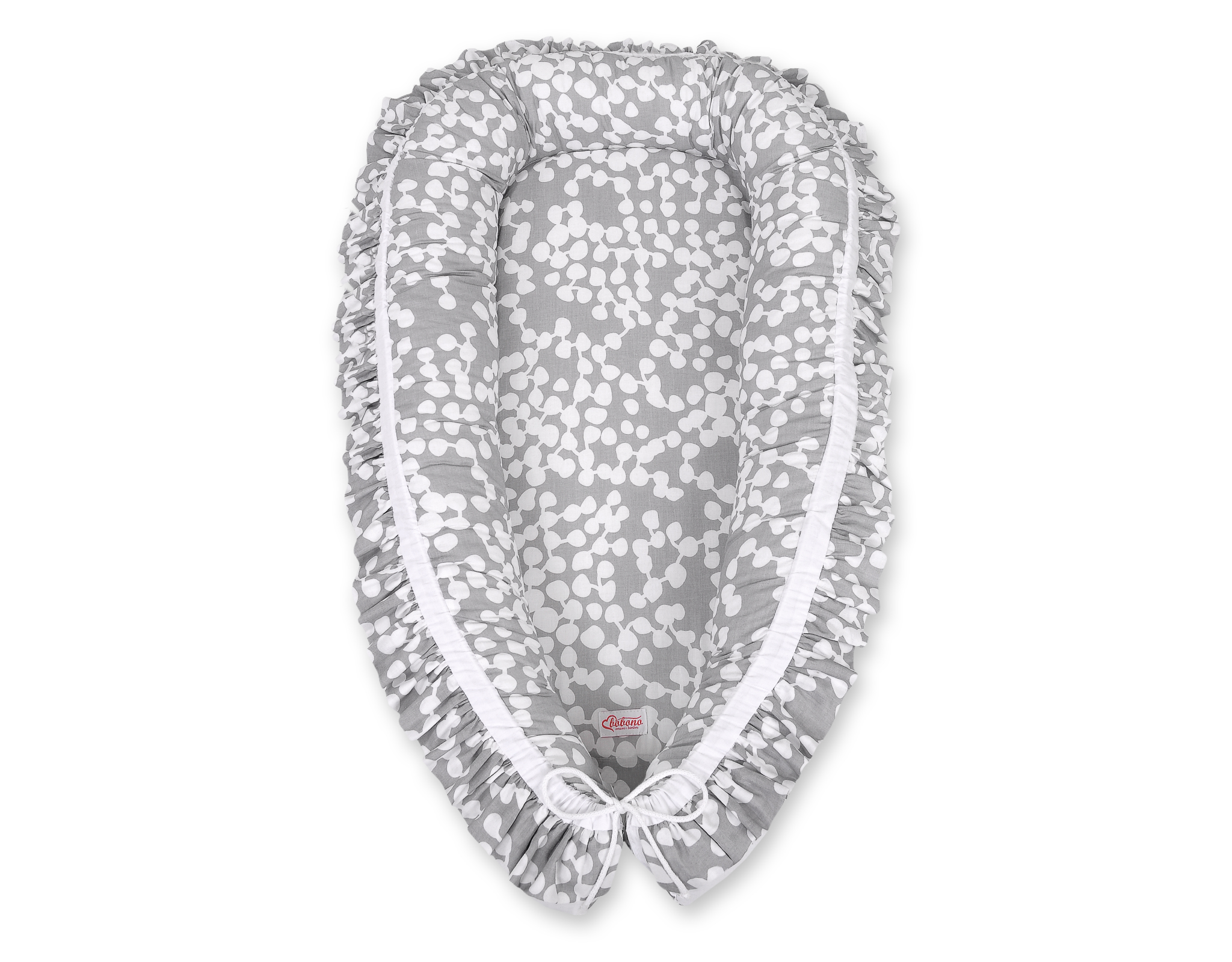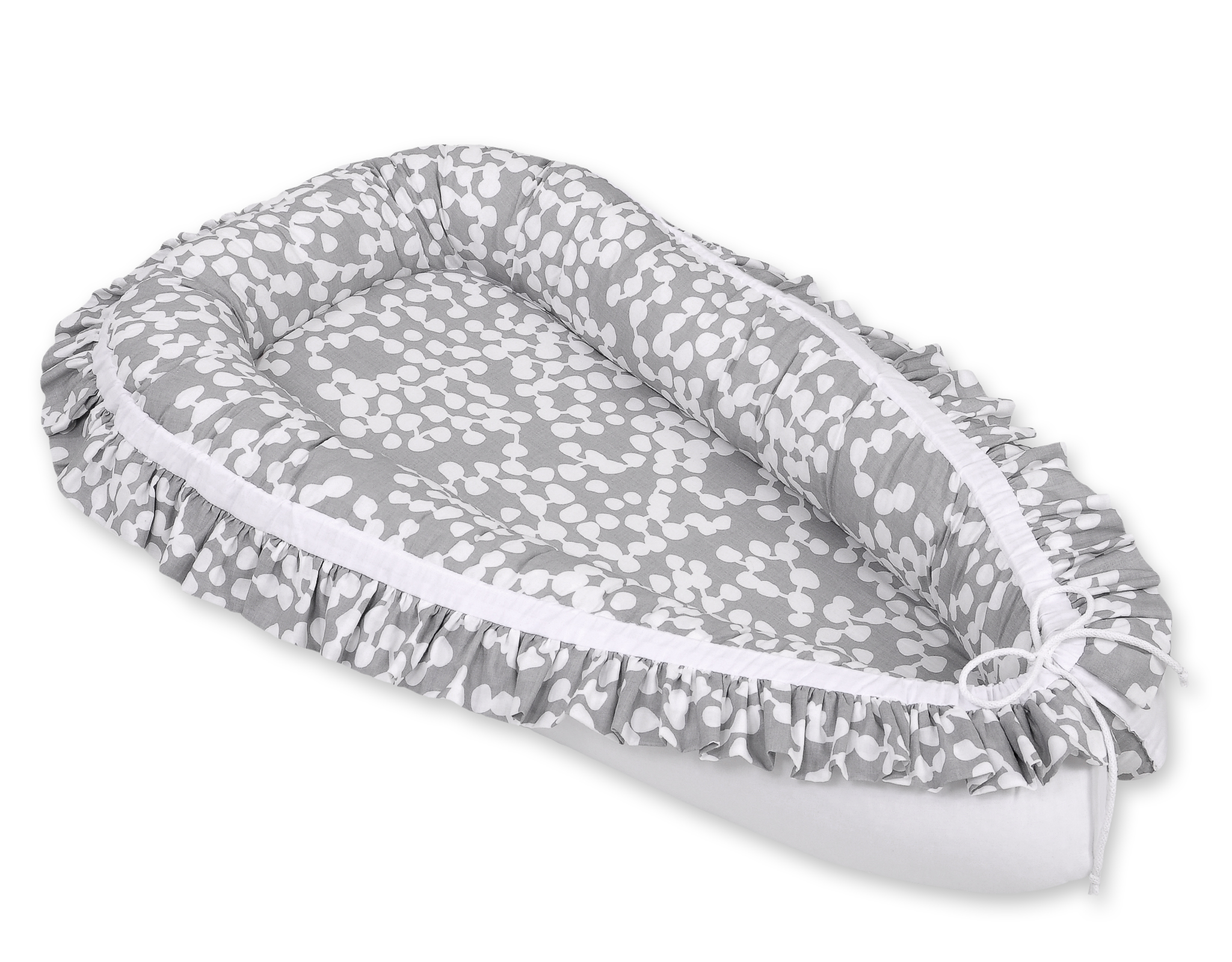 Doublesided Babynest with a ruffle - bubbles gray/white