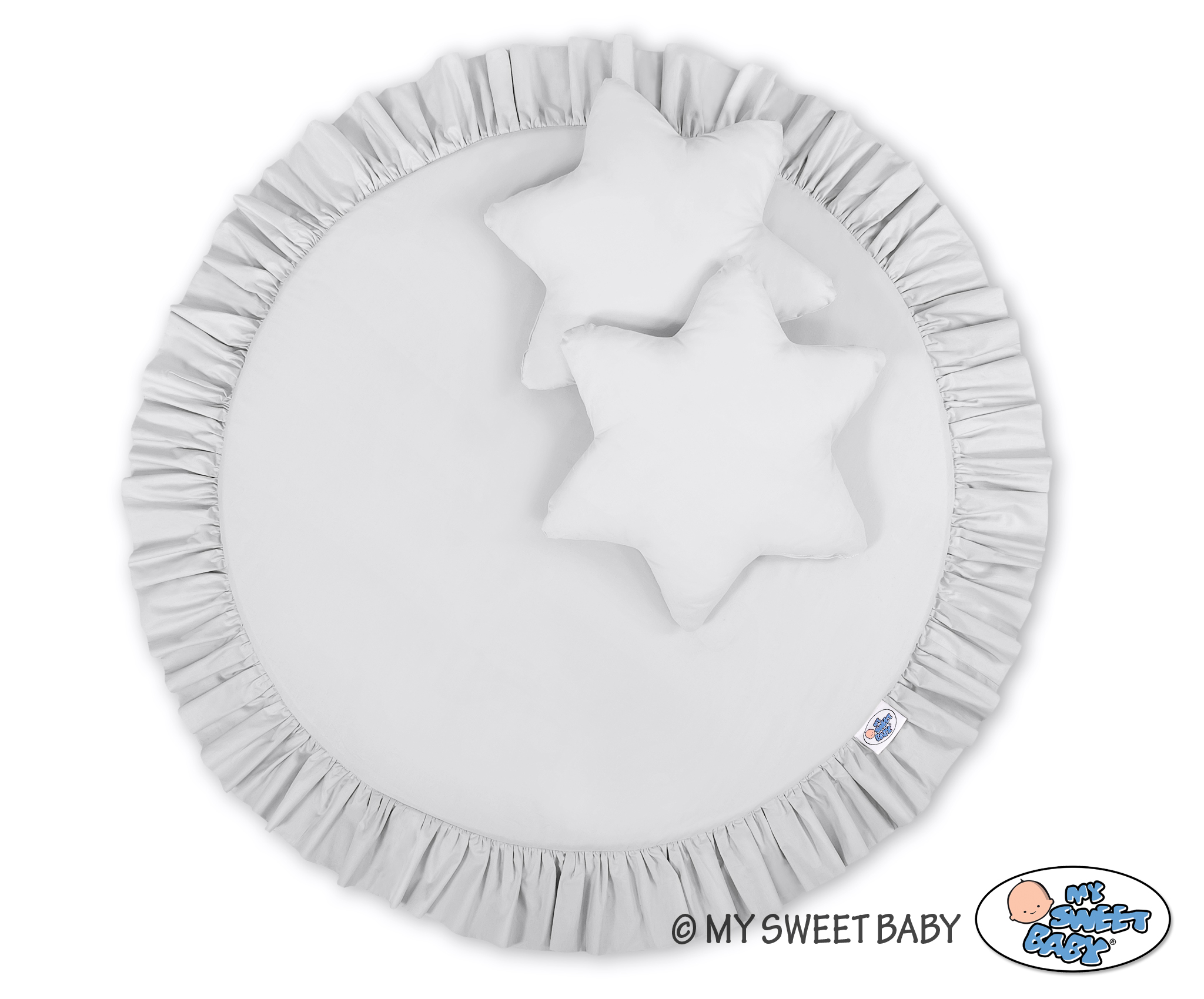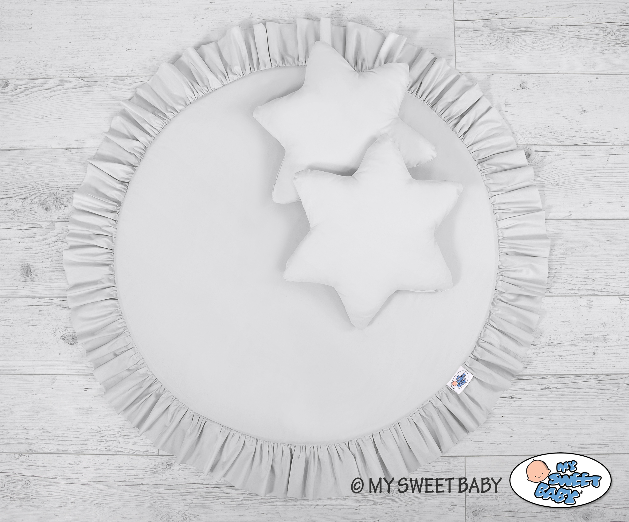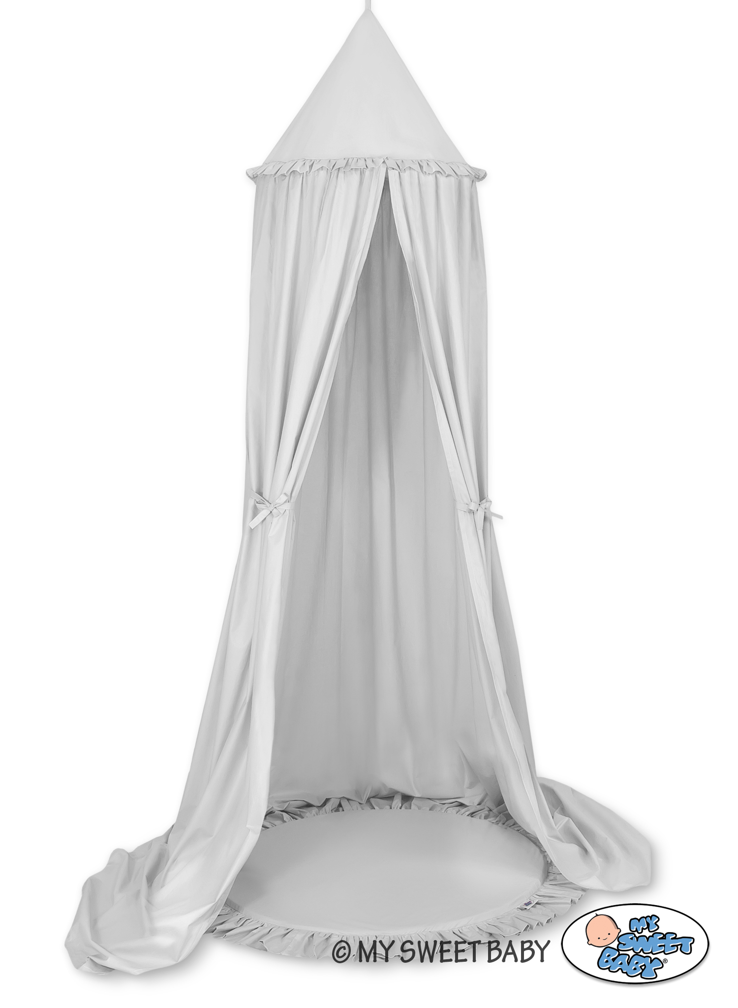 A floor play mat with ruffle. It can be used as a carpet,  play mat, or as a floor mat for the long canopy. From the first days of life can it be used as a place to rest or as a tummy time play mat. It has a soft filling that perfectly isolates from the hard and cold floor. The cover is made of OKOTEX certified 100% cotton.  The bottom of the play mat is made of a modern, anti-allergic, attested material. The bottom can be removed and the cover can be washed.