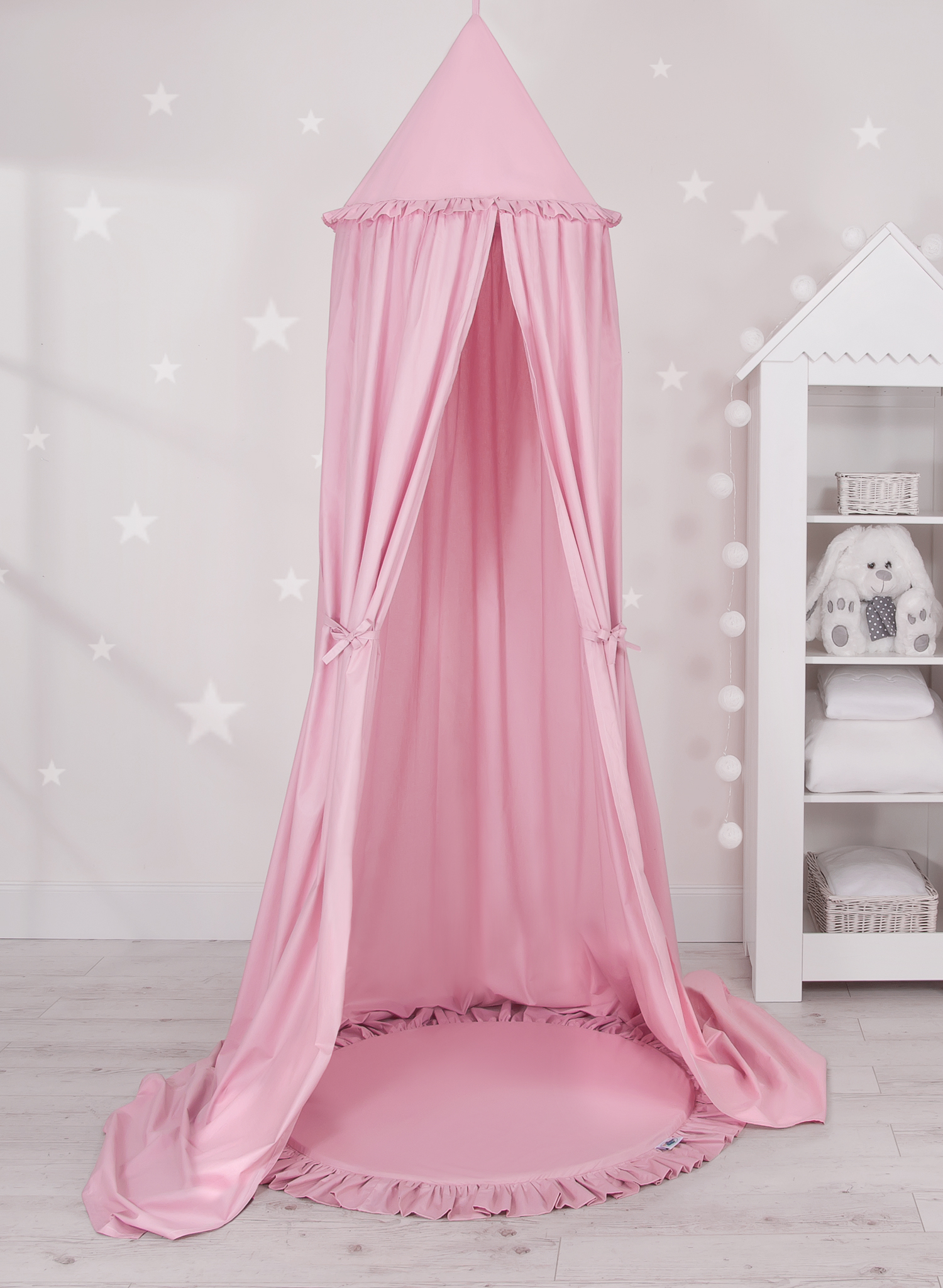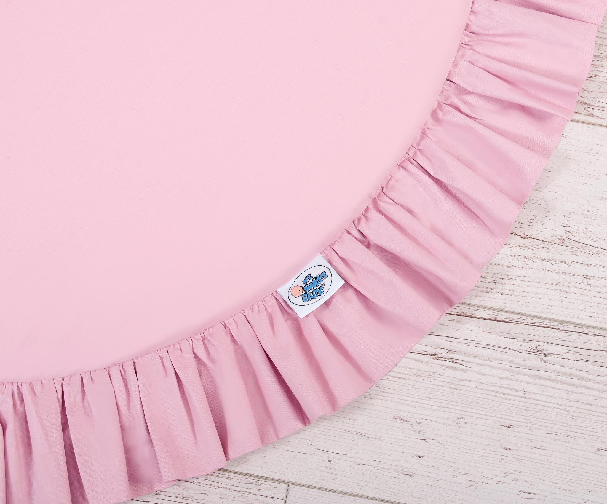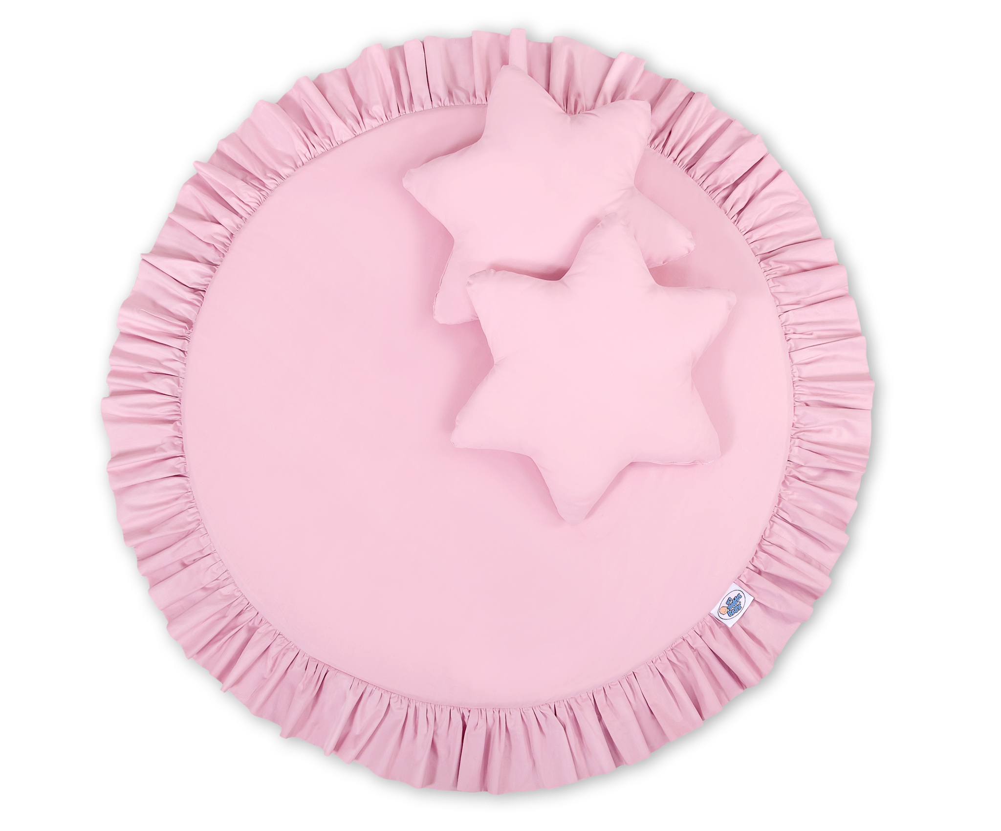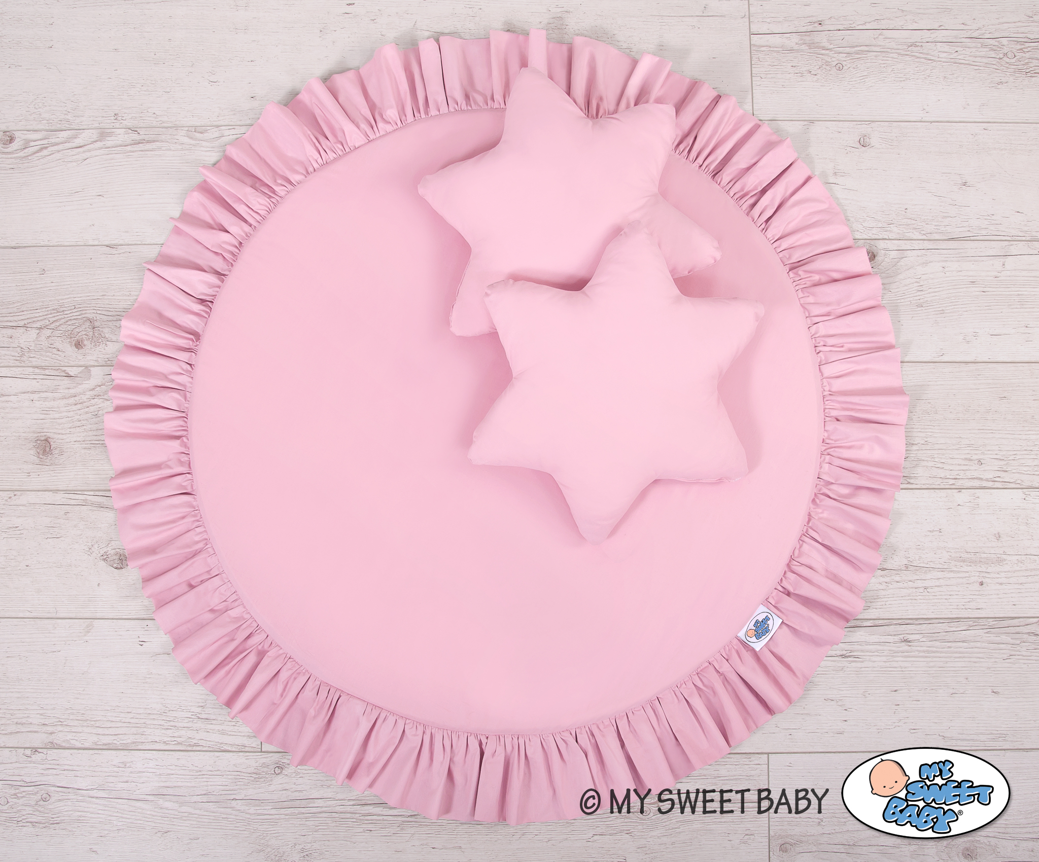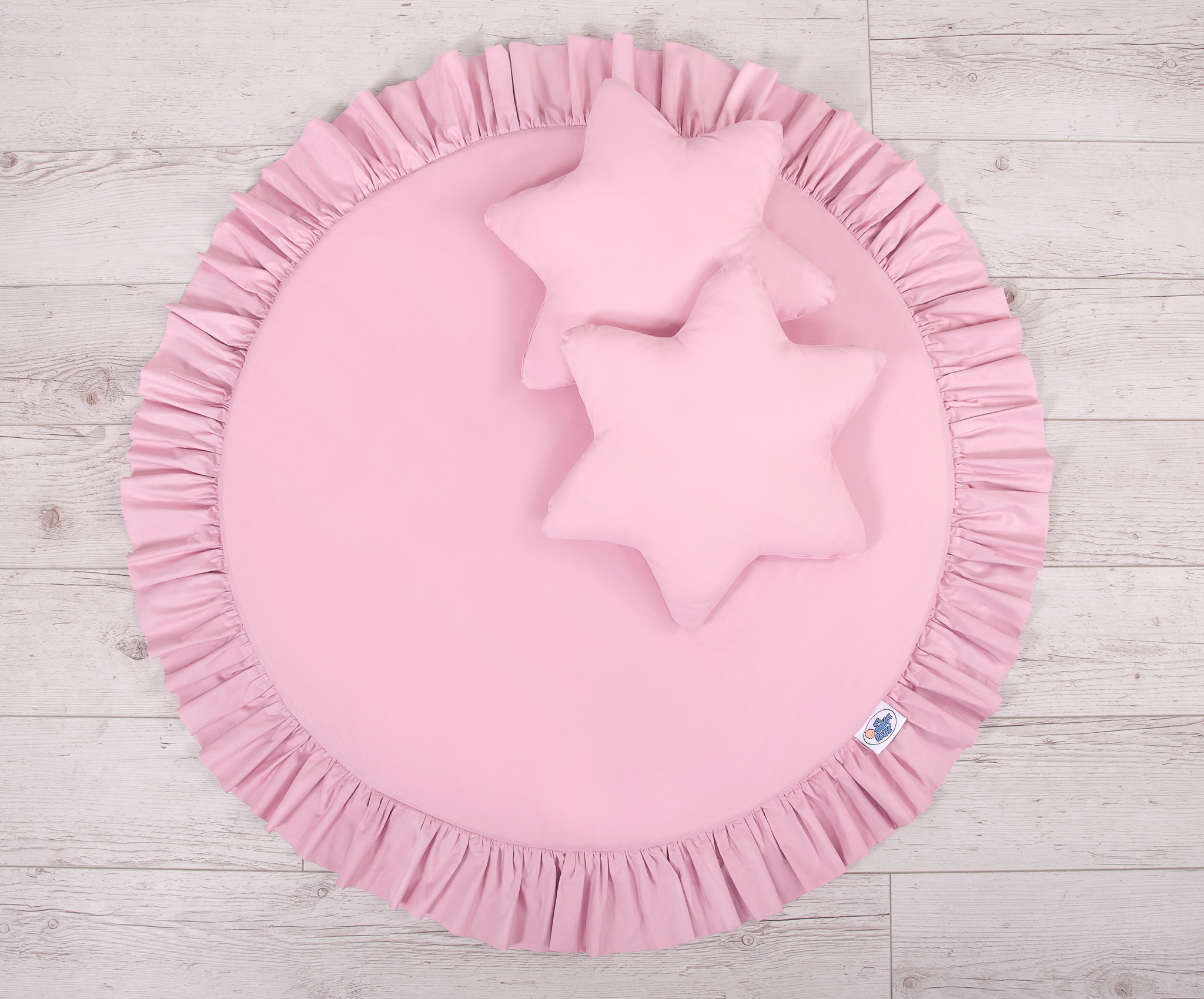 A floor play mat with ruffle. It can be used as a carpet,  play mat, or as a floor mat for the long canopy. From the first days of life can it be used as a place to rest or as a tummy time play mat. It has a soft filling that perfectly isolates from the hard and cold floor. The cover is made of OKOTEX certified 100% cotton.  The bottom of the play mat is made of a modern, anti-allergic, attested material. The bottom can be removed and the cover can be washed.