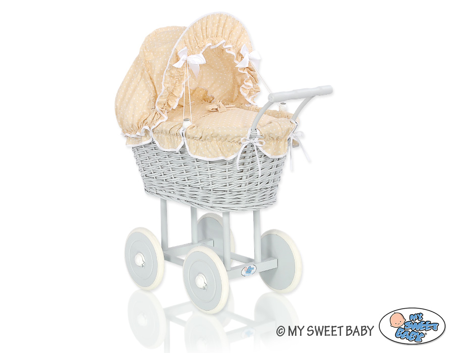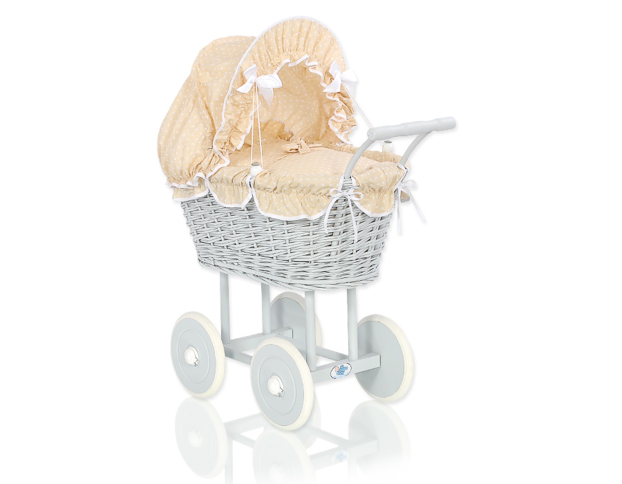 Gray Wicker Doll Pram Carriage Bedding Set in Beige with White DotsGray Wicker Doll Pram Carriage Bedding Set in Beige with White DotsGray Wicker Doll Pram Carriage Bedding Set in Beige with White Dots