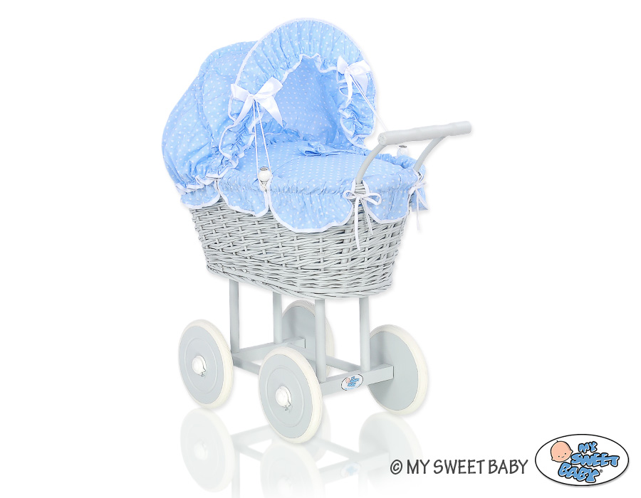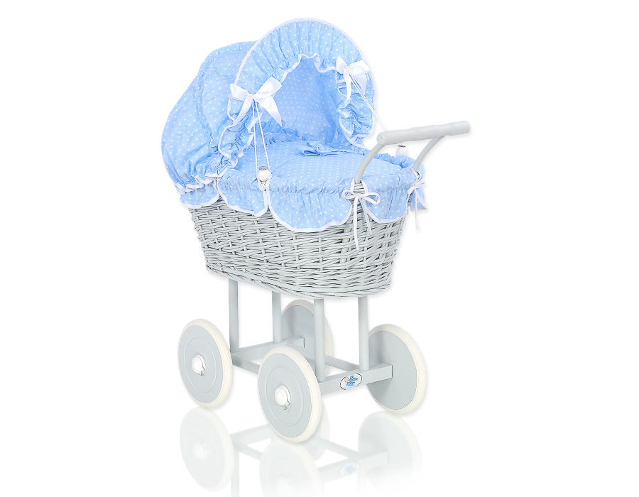 Gray Wicker Doll Pram Carriage Bedding Set White Dots on BlueGray Wicker Doll Pram Carriage Bedding Set White Dots on BlueGray Wicker Doll Pram Carriage Bedding Set White Dots on Blue