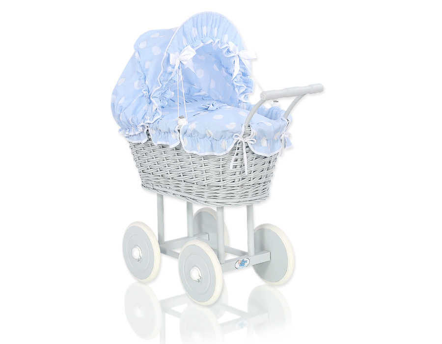 Dots White Big With Blue Carriage Pram Doll Wicker Gray