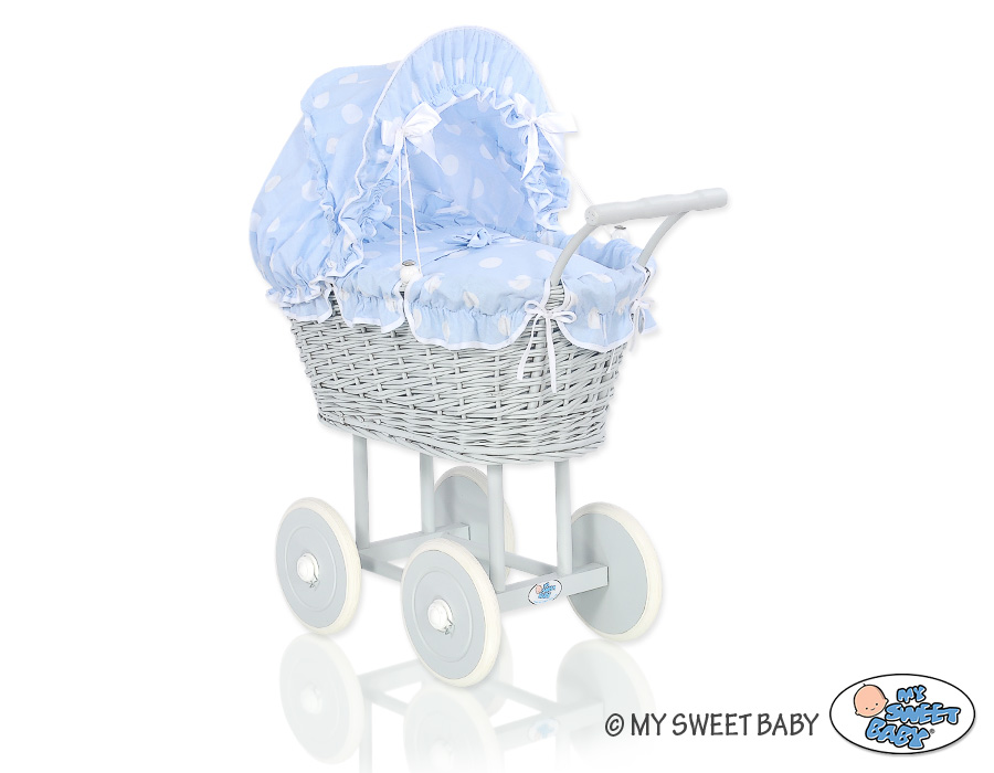 Baby Shop » Baby Toys » Doll prams » Wicker Doll prams » Gray Wicker Dolls Prams » Gray Wicker Doll Pram Carriage Blue with Big White Dots