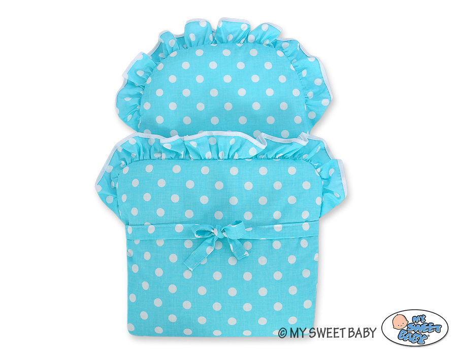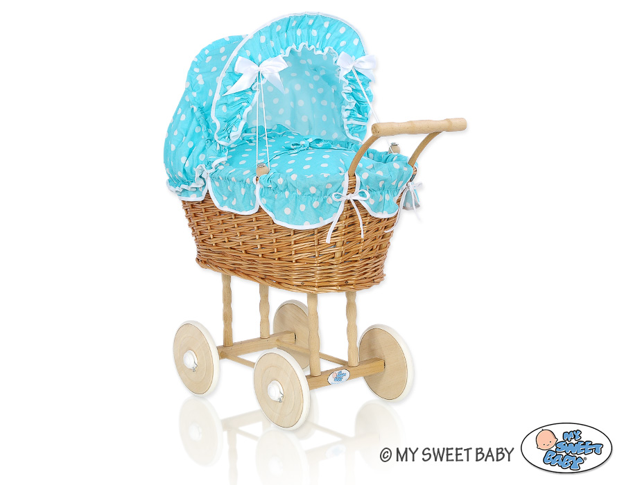 Baby Shop » Baby Toys » Doll prams » Wicker Doll prams » Natural Wicker Dolls Prams » Handmade Doll Pram Carriage Natural Wicker and Wood Turquoise with White Dots Bedding Set
