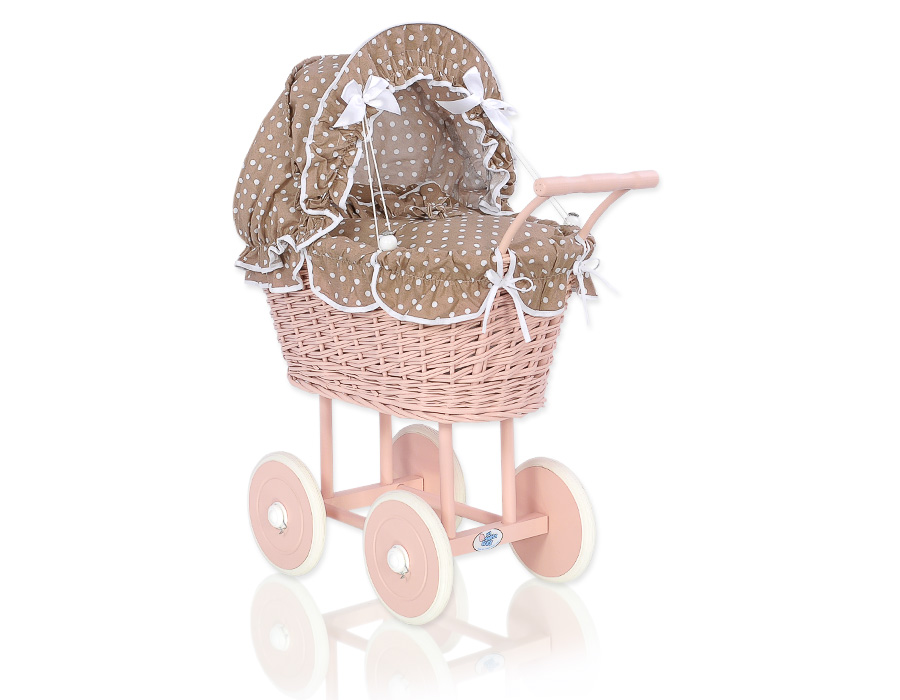 Baby Shop » Baby Toys » Doll prams » Wicker Doll prams » Powder pink Wicker Dolls Prams » Handmade Doll Pram made of Powder Pink Wicker and Wood Bedding Set White Dots on Brown