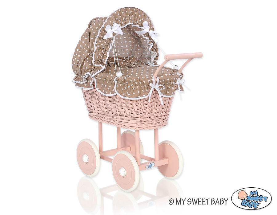 Brown On Dots White Bedding Wood And Wicker Pink Powder Of Made Pram Doll Handmade