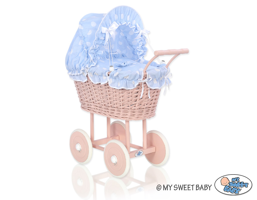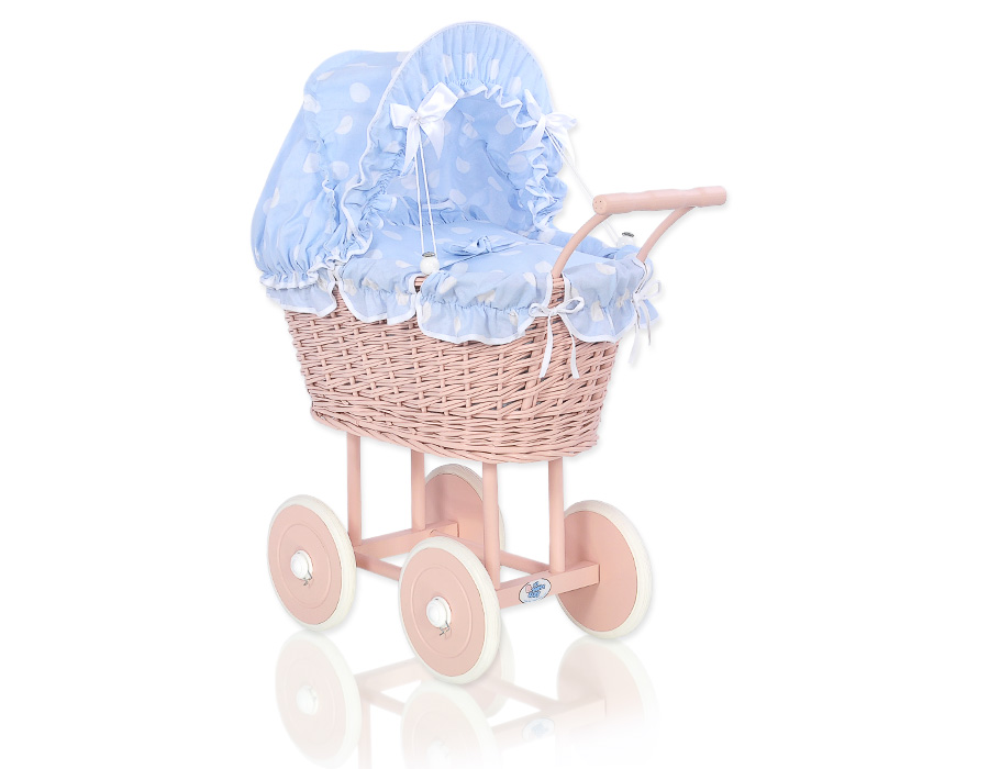 Baby Shop » Baby Toys » Doll prams » Wicker Doll prams » Powder pink Wicker Dolls Prams » Handmade Doll Pram made of Powder Pink Wicker and Wood Blue with Big White Dots