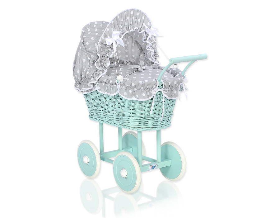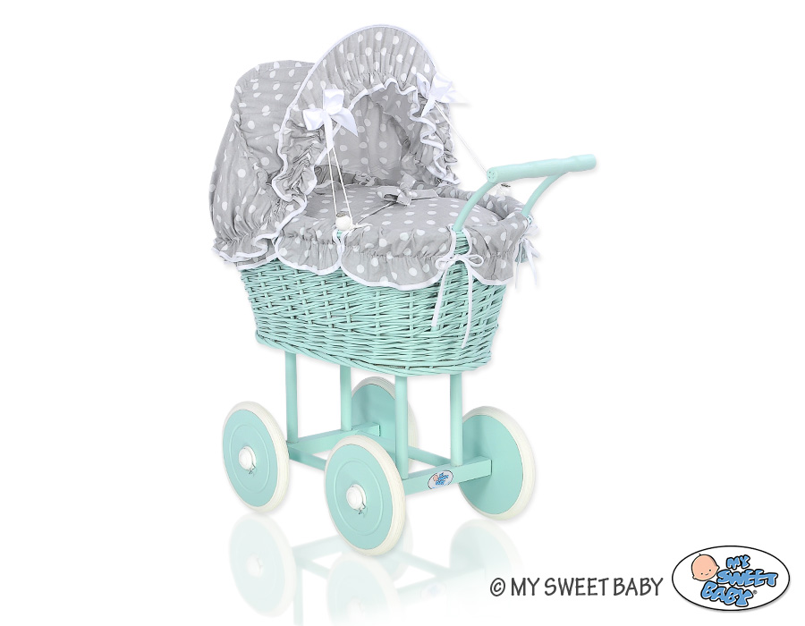 Baby Shop » Baby Toys » Doll prams » Wicker Doll prams » Mint Wicker Dolls Prams » Handmade Doll Stroller made of Mint Wicker and Wood Bedding Set White Dots on Gray