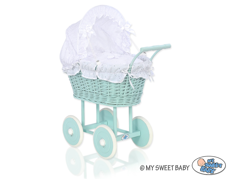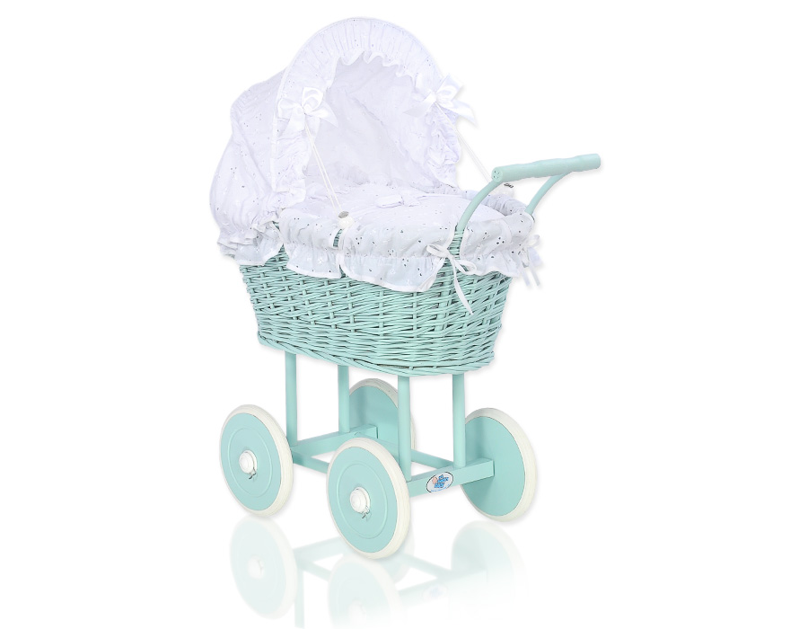 Baby Shop » Baby Toys » Doll prams » Wicker Doll prams » Mint Wicker Dolls Prams » Handmade Doll Stroller made of Mint Wicker and Wood White Bedding Set