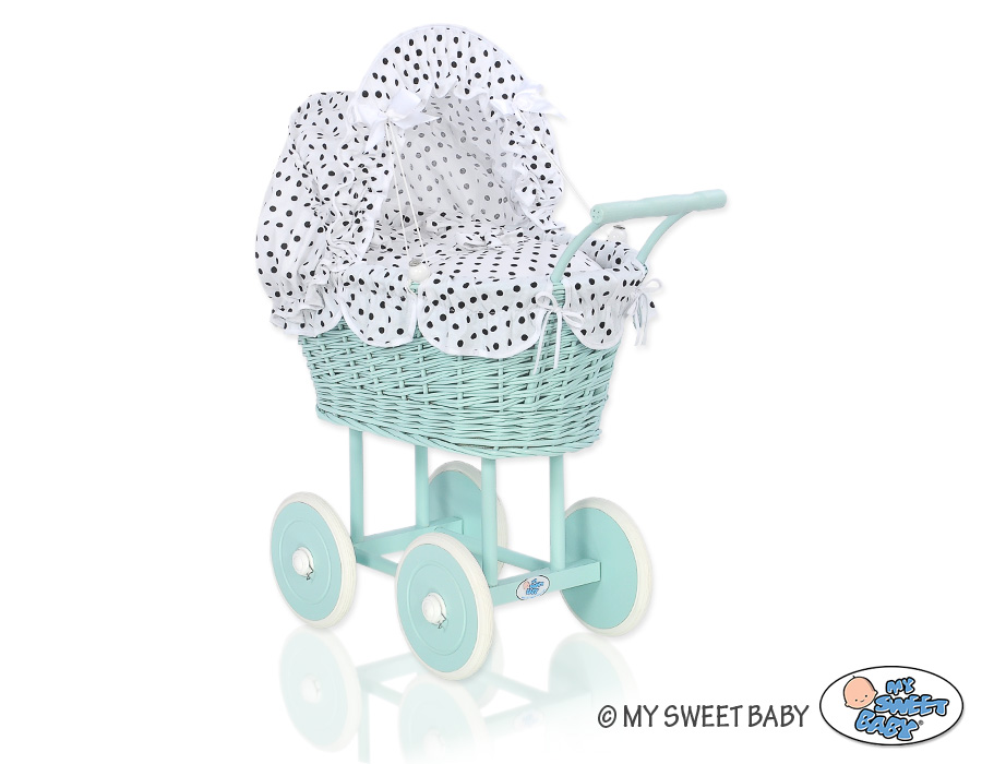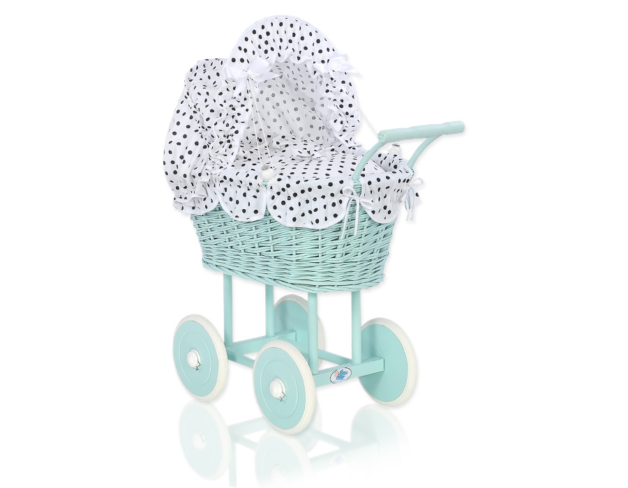 Baby Shop » Baby Toys » Doll prams » Wicker Doll prams » Mint Wicker Dolls Prams » Handmade Doll Stroller made of Mint Wicker and Wood White with Black Dots Bedding Set