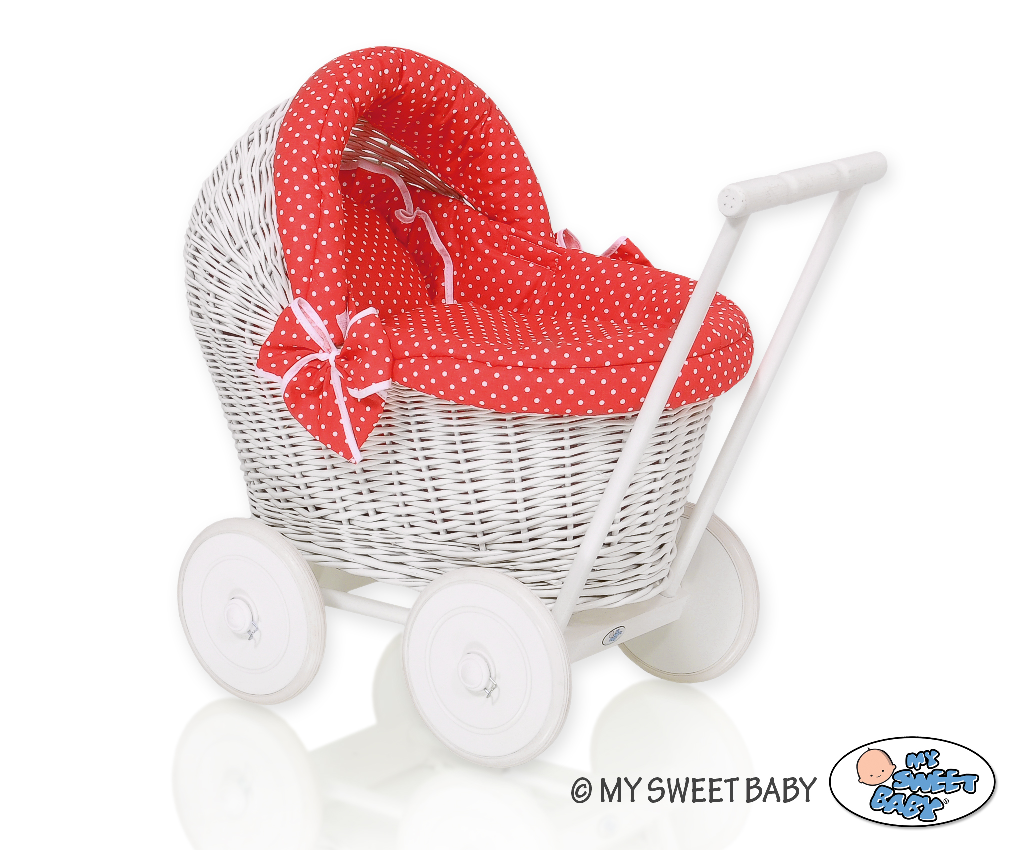 Baby Shop » Baby Toys » Doll prams » Wicker Doll prams » White Wicker Dolls Prams » Handmade Retro Style White Wicker Doll Pram Red with White Dots